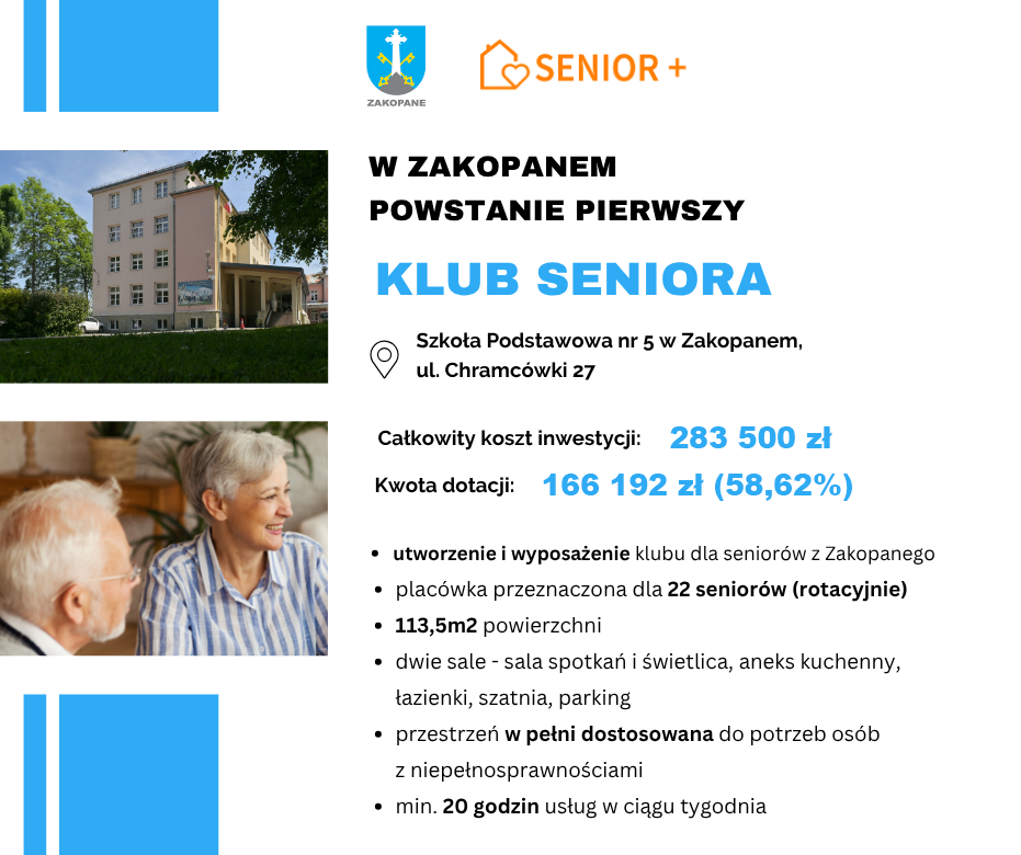 w ramach Programu Wieloletniego „Senior+”. Inicjatywa skierowana jest do nieaktywnych zawodowo mieszkańców Zakopanego w wieku 60+.