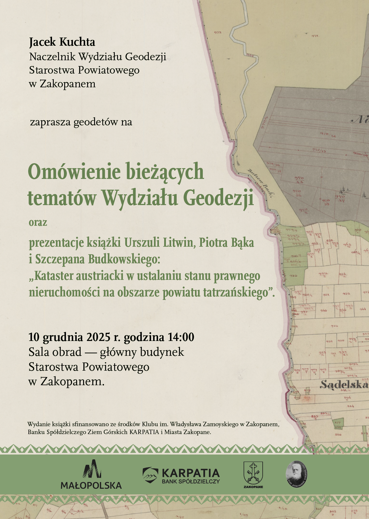 Zapraszamy na prezentacje książki Urszuli Litwin, Piotra Bąka i Szczepana Budkowskiego "Kataster austriacki w ustalaniu stanu prawnego nieruchomości na obszarze powiatu tatrzańskiego" 10 grudnia 2025 o godz. 14.00 w sali obrad w głównym budynku Starostwa Powiatowego, ul. Chramcówki 35.