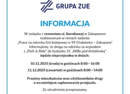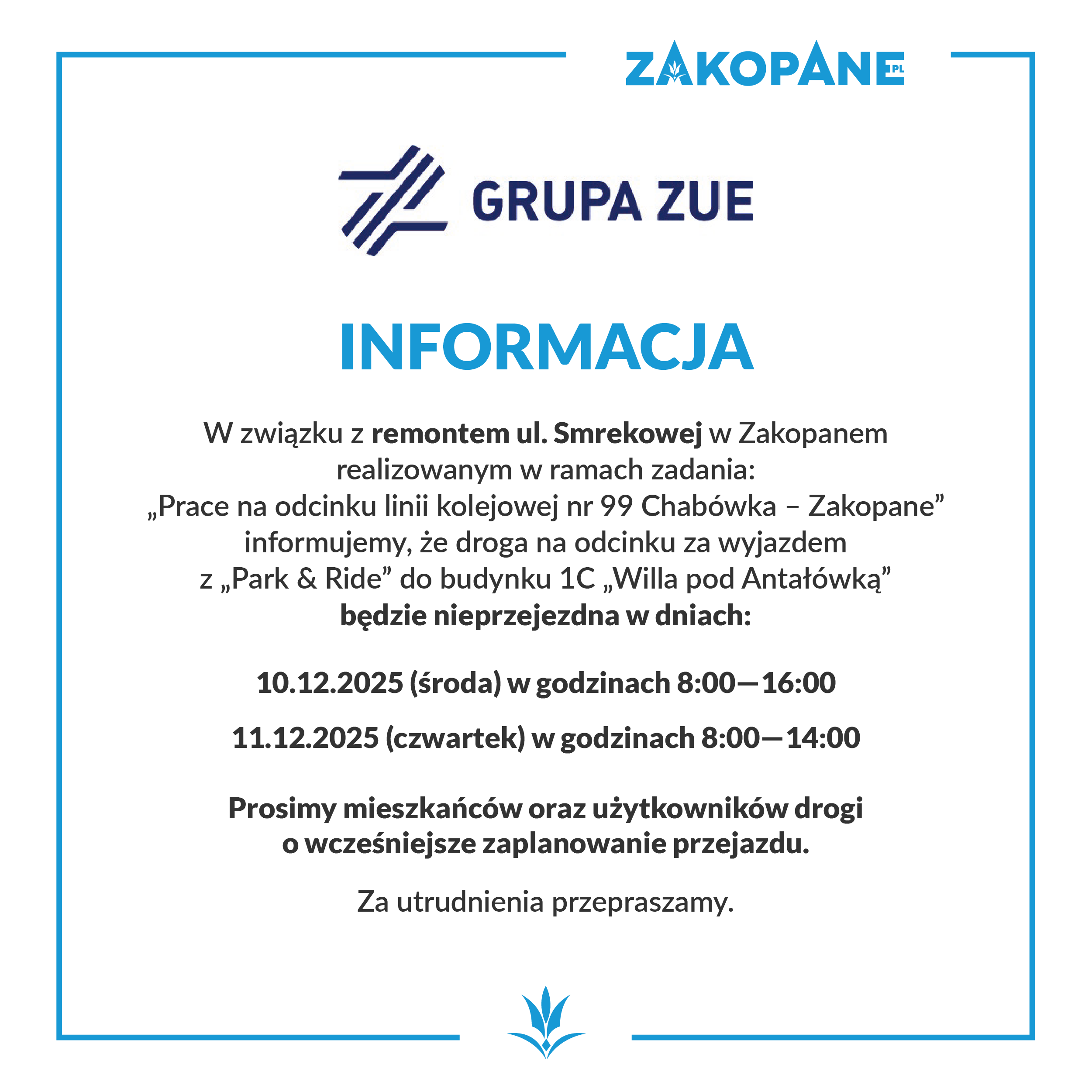 W związku z remontem ul. Smrekowej w Zakopanem realizowanym w ramach zadania: „Prace na odcinku linii kolejowej nr 99 Chabówka – Zakopane” informujemy, że droga na odcinku za wyjazdem z „Park & Ride” do budynku 1C „Willa pod Antałówką” będzie nieprzejezdna w dniach
