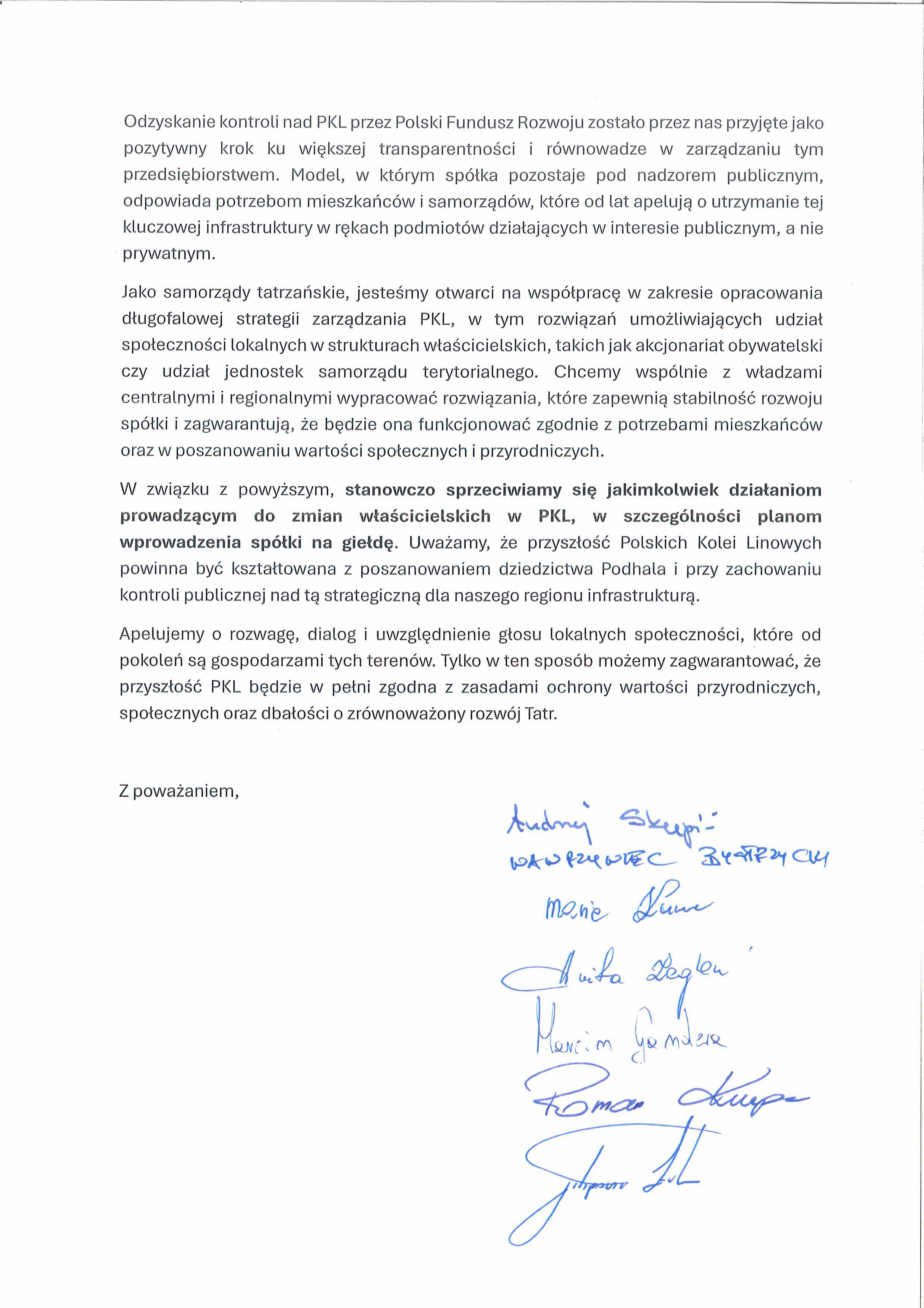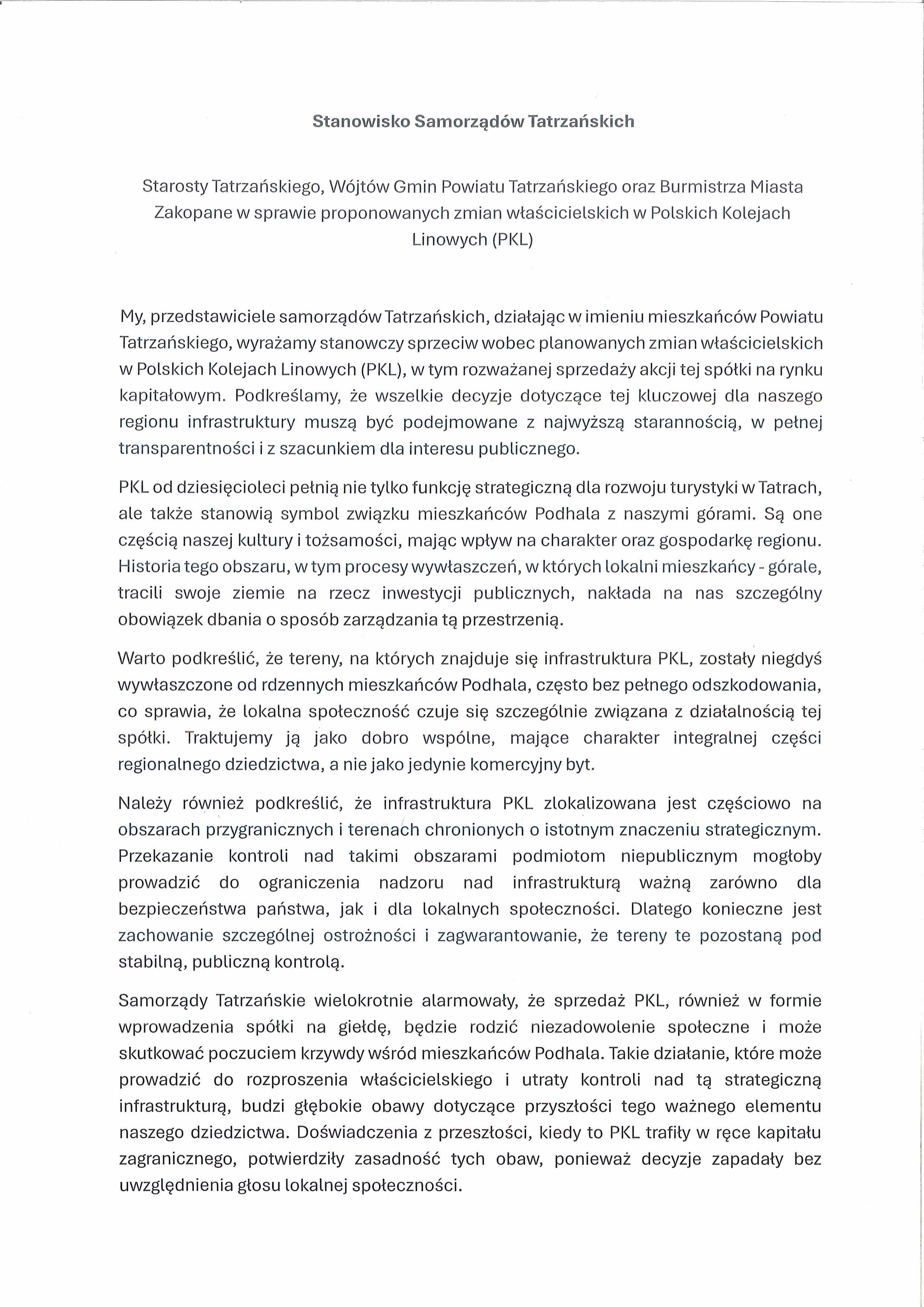 Największe emocje wywołały plany wprowadzenia spółki PKL S.A. na giełdę. Samorządowcy jednoznacznie przedstawili negatywne stanowisko wobec tego pomysłu. Podkreślono, że PKL S.A. działa na terenach przygranicznych i obszarach chronionych, dlatego powinna realizować cele rozwojowe regionu, a nie jedynie maksymalizować zyski finansowe. Zwrócono uwagę na konieczność wyciągnięcia wniosków z wcześniejszych doświadczeń prywatyzacyjnych i podkreślono znaczenie transparentności, przejrzystych planów inwestycyjnych oraz utrzymania kontroli nad strategiczną infrastrukturą Tatr. W rezultacie opracowano wspólne Stanowisko Samorządów Tatrzańskich. Pełną treść dokumentu można znaleźć tutaj oraz w galerii poniżej.