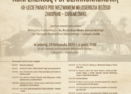 Zapraszamy na popularnonaukową konferencję "40-lecie Parafii pod wezwaniem Miłosierdzia Bożego na Chramcówkach" 29 listopada 2025 r. o godz. 9.00 w sali kinowej parafii na Chramcówkach.