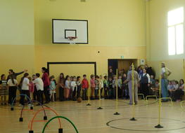 Po części artystycznej przyszłoroczni pierwszoklasiści udali się na zwiedzanie szkoły. Po drodze brali udział w różnorodnych zajęciach: oglądali fascynujące doświadczenia, rozwiązywali zagadki logiczne i językowe, uczestniczyli w zabawach ruchowych, a także poznali tajniki produkcji gniotków. Było ciekawie i wesoło.