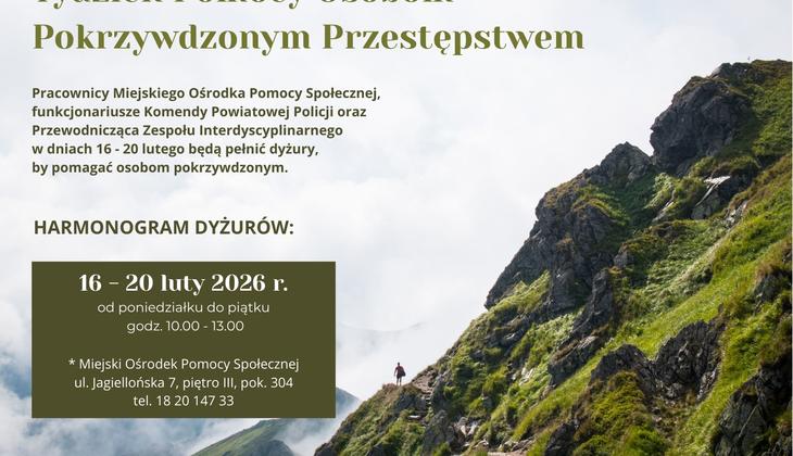 Miejski Ośrodek Pomocy Społecznej w Zakopanem wraz z Komendą Powiatową Policji i Przewodniczącą Zespołu Interdyscyplinarnego, dołączają się do powyższej inicjatywy, informują, że w dniach od 16 lutego do 20 lutego 2026 r., w godzinach 10.00 – 13.00 osoby pokrzywdzone przestępstwem mogą zgłaszać się do Miejskiego Ośrodka Pomocy Społecznej, przy ul. Jagiellońska 7 w Zakopanem, piętro III pokój 304, celem zapoznania się z dostępnymi formami pomocy.