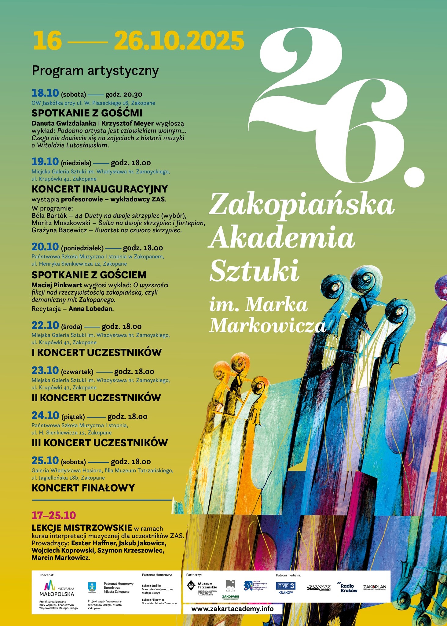 Serdecznie zapraszamy na wydarzenia w ramach 26. edycji Zakopiańskiej Akademii Sztuki. Przed nami dni pełne koncertów, spotkań i artystycznych wrażeń.