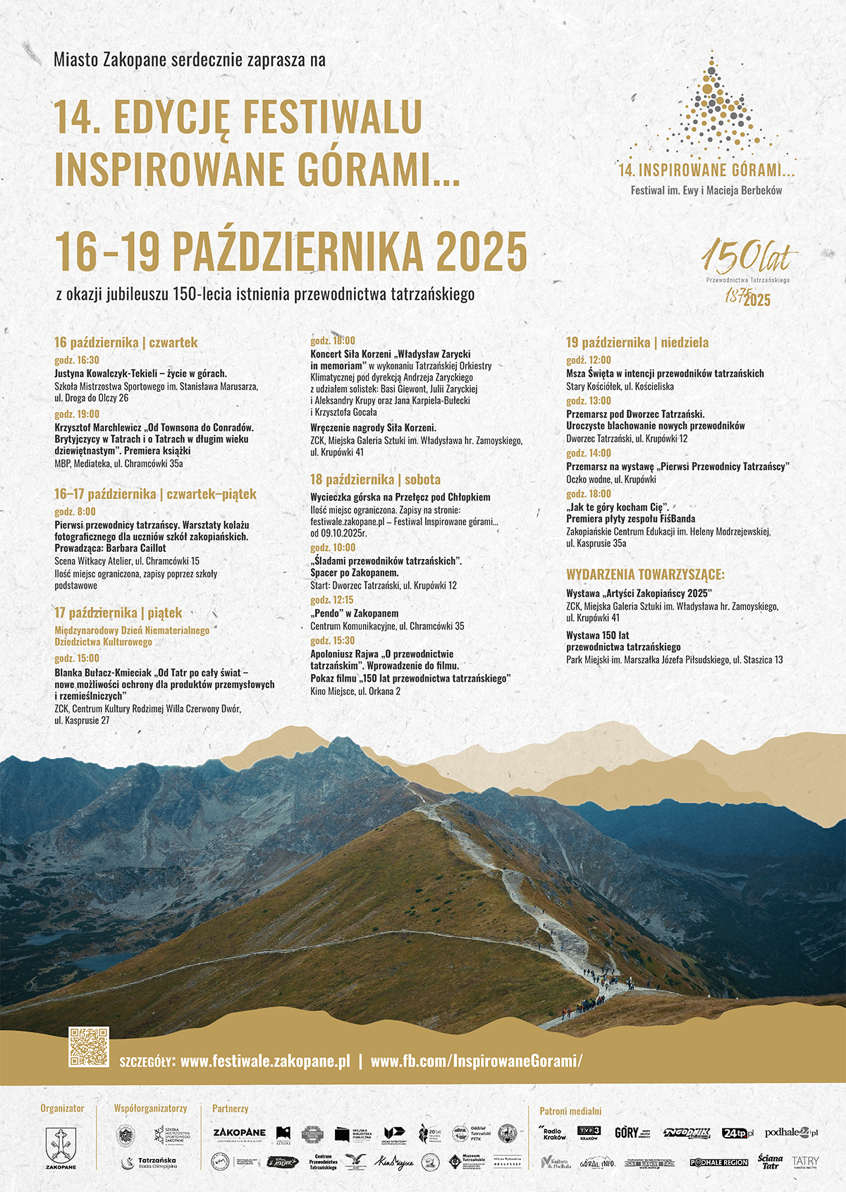 Zakopane ponownie stanie się miejscem, gdzie spotkają się pasja, tradycja i kultura gór. Od 16 do 19 października odbędzie się kolejna edycja „Festiwalu „Inspirowane górami…” im. Ewy i Macieja Berbeków” – wydarzenia, które w wyjątkowy sposób łączy sztukę, sport, historię, rzemiosło i duchowe dziedzictwo Tatr. Program festiwalu obfituje w spotkania z inspirującymi ludźmi, premiery książek, koncerty, warsztaty oraz wydarzenia plenerowe. Wśród gości znajdą się znane osobowości świata sportu, kultury i nauki. Festiwal to urodziny naszego miasta, dlatego w sposób szczególny zapraszamy mieszkańców Zakopanego do wspólnego świętowania i integracji. Bo Zakopane to przede wszystkim my – jego mieszkańcy!
