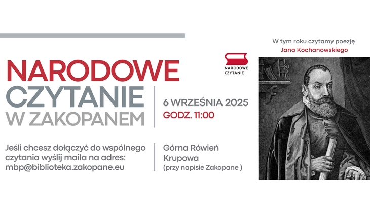 W sobotę 6 września 2025 roku o godz. 11:00 na Górnej Równi Krupowej (przy napisie Zakopane) rozpocznie się kolejna odsłona akcji „Narodowego Czytania”, zainicjowanej przez Prezydenta Rzeczpospolitej Polskiej w 2012 roku. Głównym celem akcji jest popularyzowanie czytelnictwa oraz wzmocnienie poczucia narodowej tożsamości poprzez publiczne odczytywanie tekstów największych dzieł literatury polskiej.