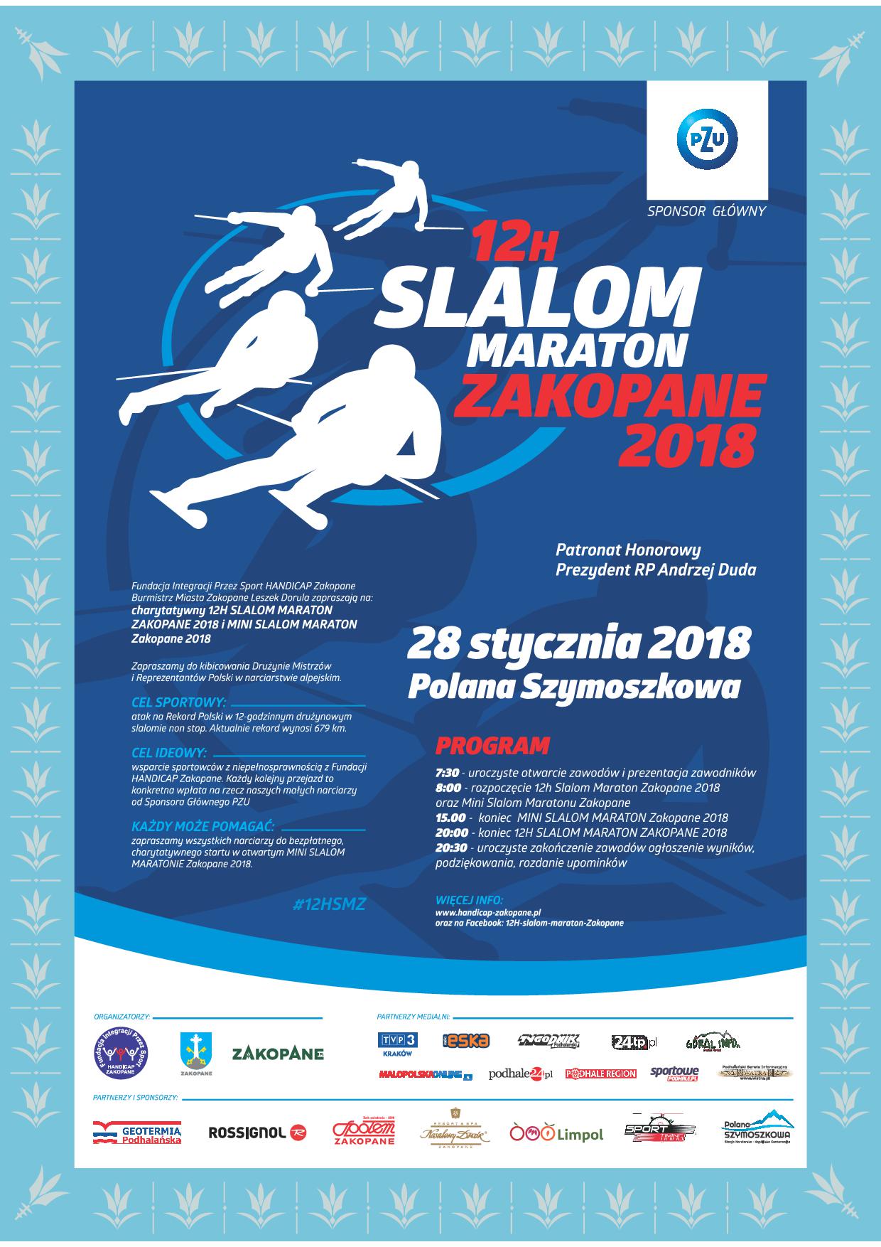 Fundacja HANDICAP Zakopane i Miasto Zakopane zapraszają miłośników narciarstwa na Polanę Szymoszkową w niedzielę 28.01.2018 na zawody narciarskie 12H SLALOM MARATON ZAKOPANE 2018. Oficjalne rozpoczęcie o godz.7.30.