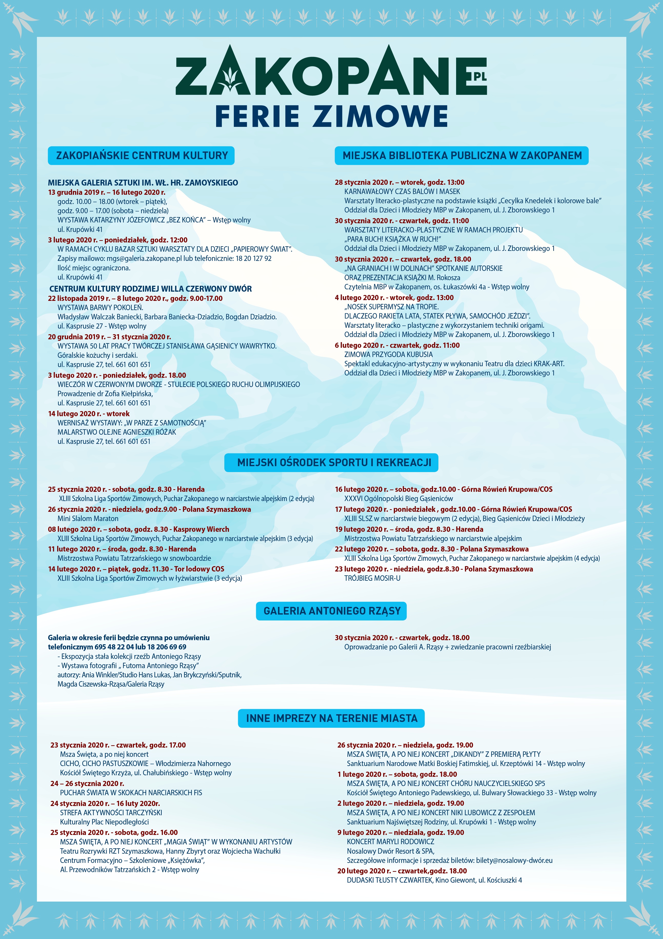 Czas rozpoczynających się małopolskich ferii zimowych bardzo miło można spędzić w Zakopanem, korzystając nie tylko z uroków zimy, ale także z szerokiej oferty kulturalnej i sportowej przygotowanej przez zakopiańskie instytucje: Zakopiańskie Centrum Kultury, Miejską Bibliotekę Publiczną, Miejski Ośrodek Sportu i Rekreacji oraz Galerię Antoniego Rząsy.