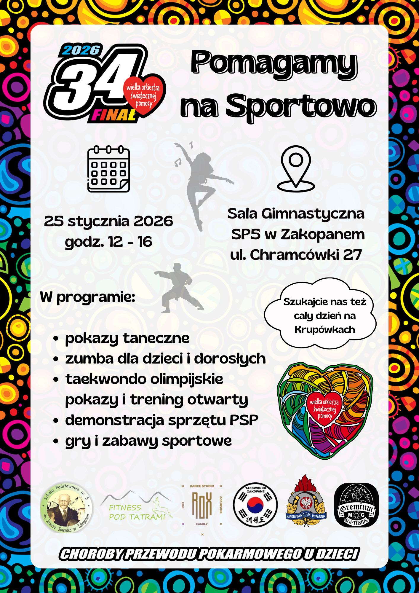 Chcesz wesprzeć Wielką Orkiestrę Świątecznej Pomocy, a przy tym świetnie się bawić? Wpadnij do SP 5 przy ul. Chramcówki 27 w niedzielę, 25 stycznia 2026, godz.: 12:00 – 16:00 i poczuj sportową energię! W tym roku zbieramy fundusze na walkę z chorobami przewodu pokarmowego u dzieci.