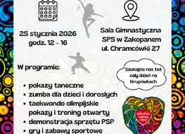 W programie: pokazy taneczne, energetyczna zumba dla każdego, taekwondo - pokazy i otwarty trening, pokaz profesjonalnego sprzętu Państwowej Straży Pożarnej, gry, zabawy i mnóstwo sportowych emocji.