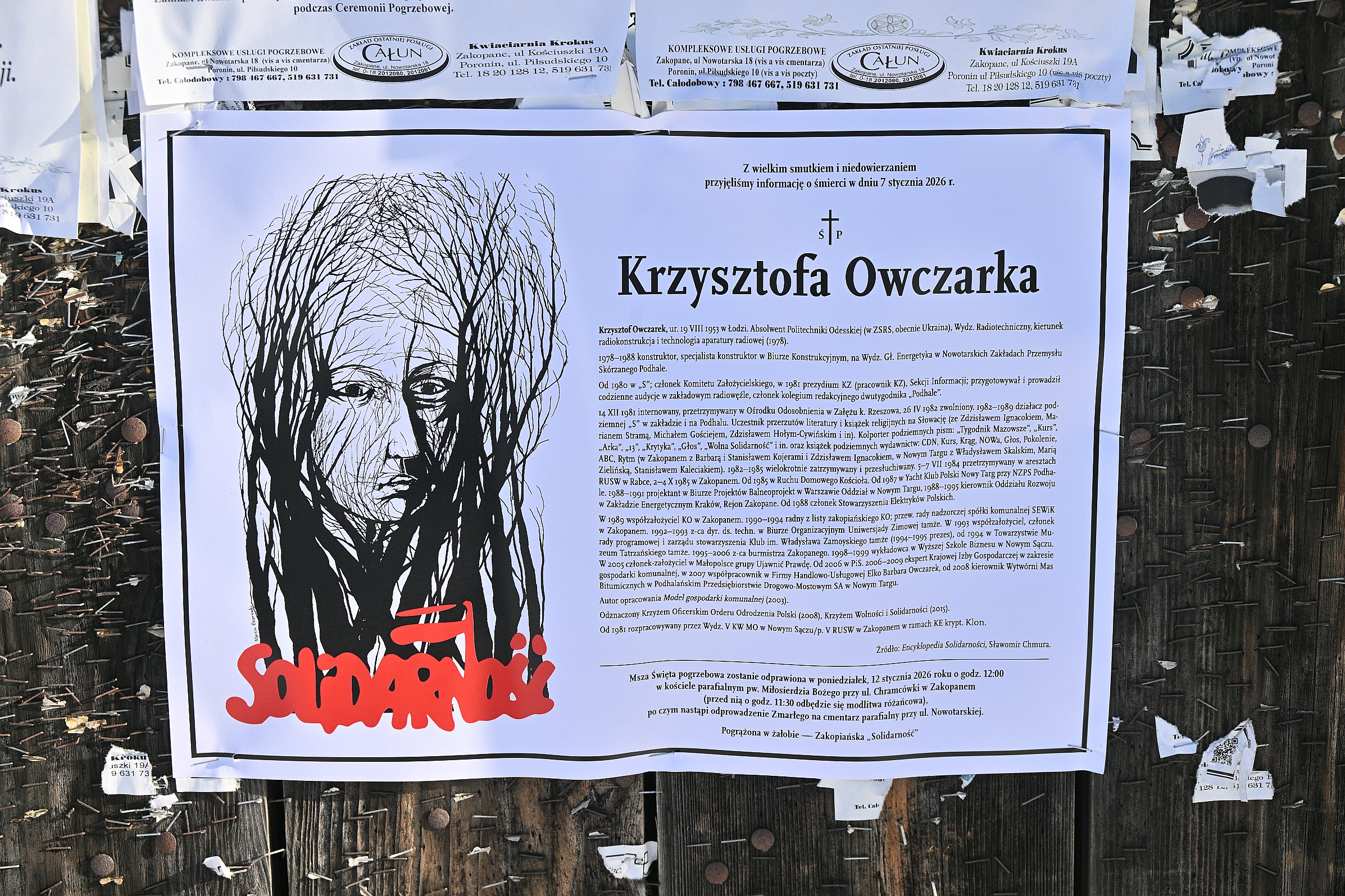 W poniedziałek, 12 stycznia 2026, w Kościele Miłosierdzia Bożego na Chramcówkach i na zakopiańskim cmentarzu pożegnaliśmy ŚP. Krzysztofa Owczarka, zastępcę burmistrza Zakopanego w latach 1995 - 2006, działacza zakopiańskiej "Solidarności". Po raz ostatni oddaliśmy hołd Człowiekowi, który pozostanie w naszej pamięci.