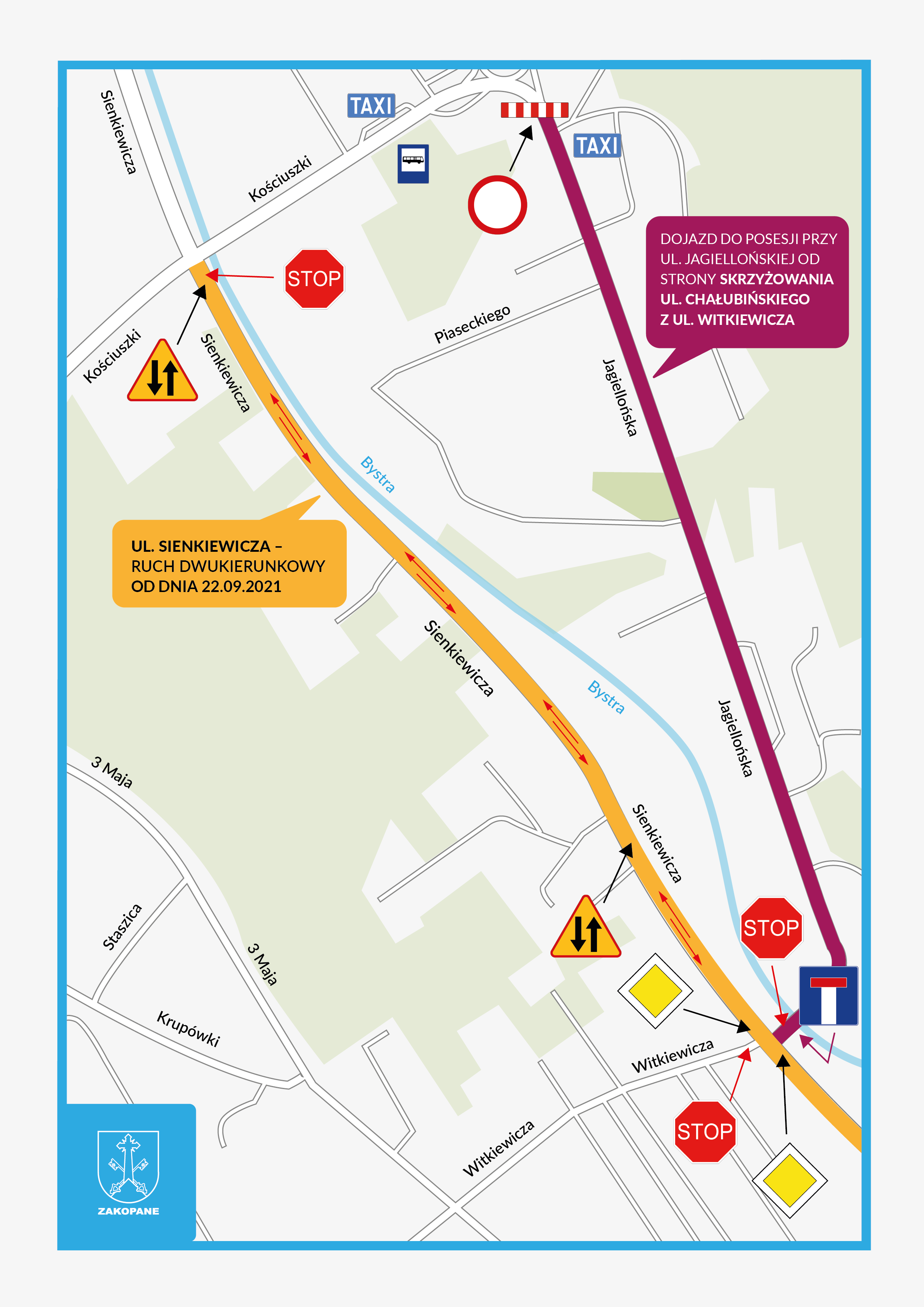 Jednocześnie informujemy, że w celu usprawnienia ruchu kołowego na czas zamknięcia ul. Jagiellońskiej, wprowadzona zostanie tymczasowa organizacja ruchu na ul. Henryka Sienkiewicza, gdzie ruch odbywać się będzie w dwóch kierunkach. Dodatkowo zmianie ulegnie organizacja ruchu na skrzyżowaniu ulic Henryka Sienkiewicza, Jagiellońskiej, Tytusa Chałubińskiego oraz Stanisława Witkiewicza.