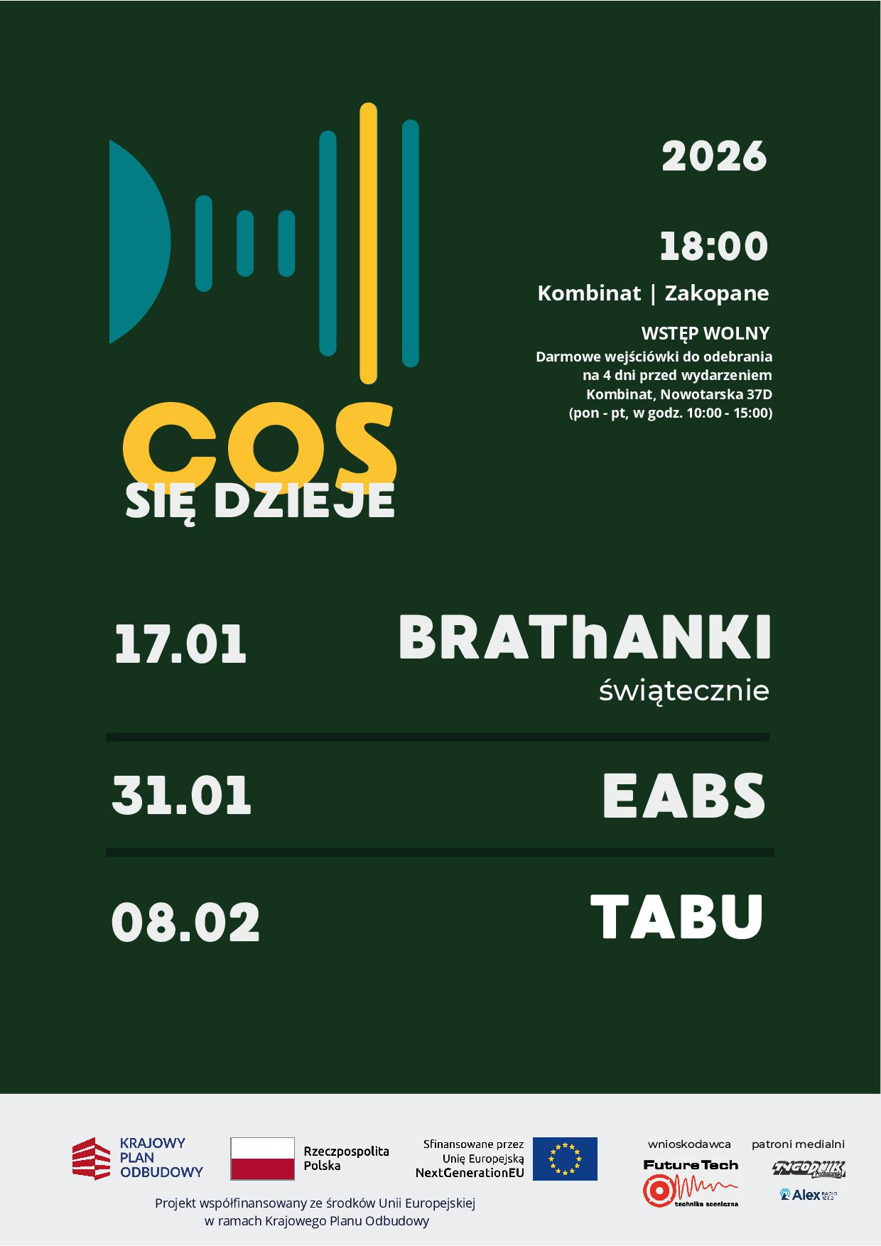 - 18:00 Koncert zespołu TABU, Kombinat, Nowotarska 37D, wstęp wolny, Darmowe wejściówki do odebrania 4 dni przed wydarzeniem