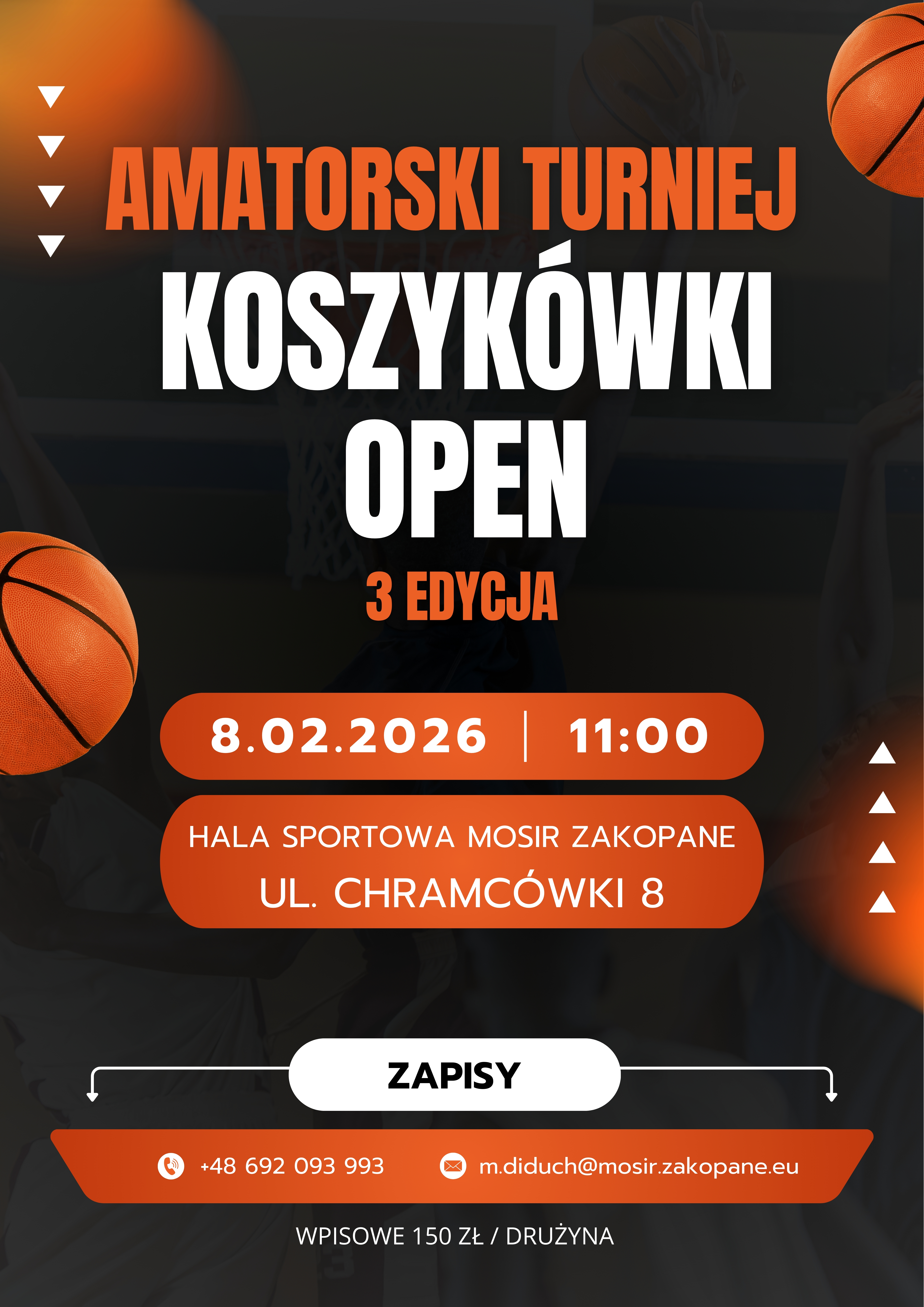 - 11:00 Amatorski Turniej Koszykówki OPEN 3 edycja Hala Sportowa MOSIR ul. Chramcówki 8, wpisowe Zapisy: m.diduch@mosir.zakoane.eu,