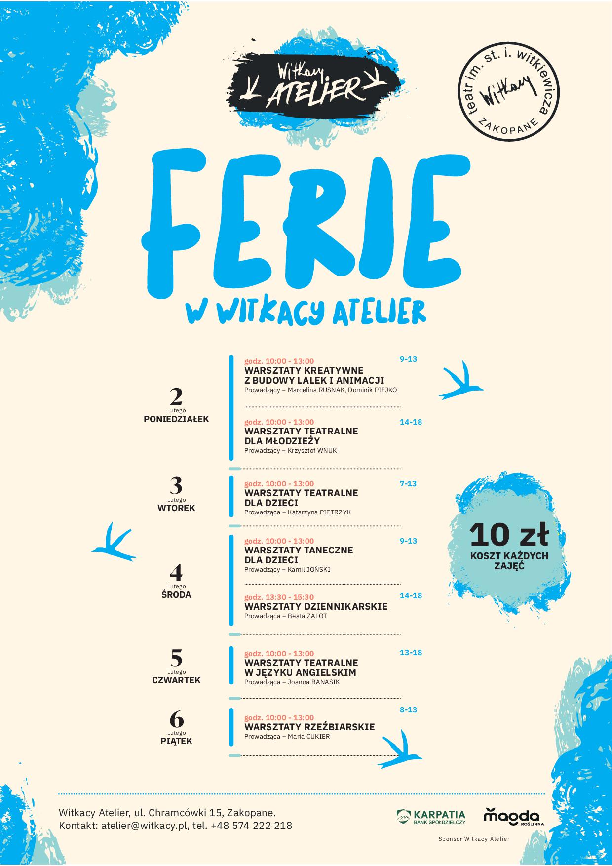 Dziesiątki warsztatów, wycieczek, zajęć sportowych i artystycznych, koncertów i spektakli czekają na wszystkich, którzy zdecydują się spędzić ferie zimowe pod Giewontem. Zapraszamy mieszkańców i turystów do zapoznania się z przygotowaną ofertą. Życzymy dobrej zabawy i miłego wypoczynku!