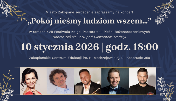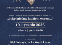 Już w najbliższą sobotę, 10 stycznia 2026 roku o godz. 18:00 w Zakopiańskim Centrum Edukacji im. H. Modrzejewskiej odbędzie się wyjątkowy koncert w ramach XVII Festiwalu Kolęd, Pastorałek i Pieśni Bożonarodzeniowych „Dobrze żeś się Jezu pod Giewontem zrodził” pt. „Pokój nieśmy ludziom wszem…”.