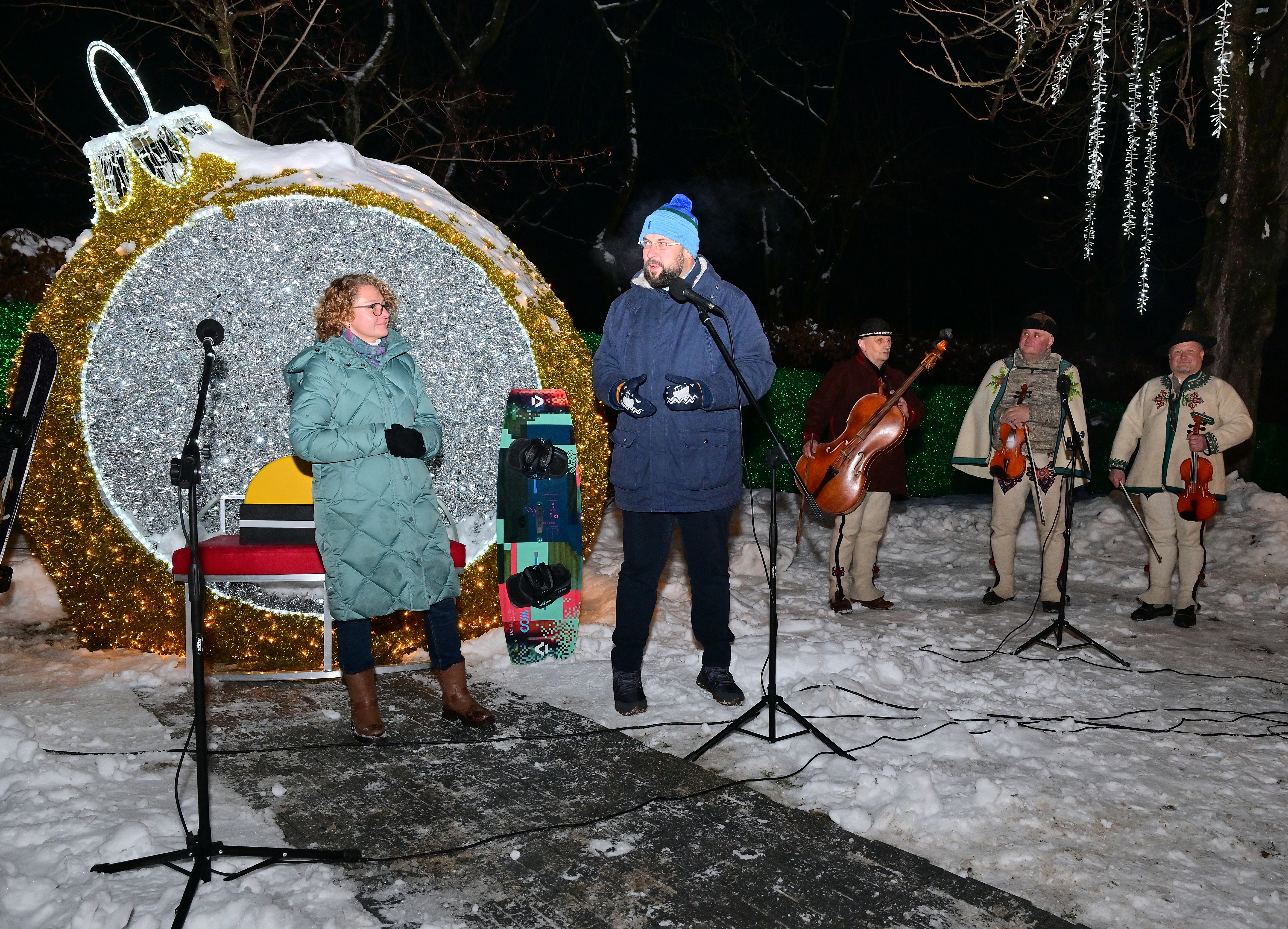 Po oficjalnej wymianie desek przyszedł czas na kolejny ważny moment, symboliczne rozświetlenie choinki, które zgromadziło wielu mieszkańców i turystów. Atmosferę wydarzenia dopełniła muzyka Kapeli Góralskiej.