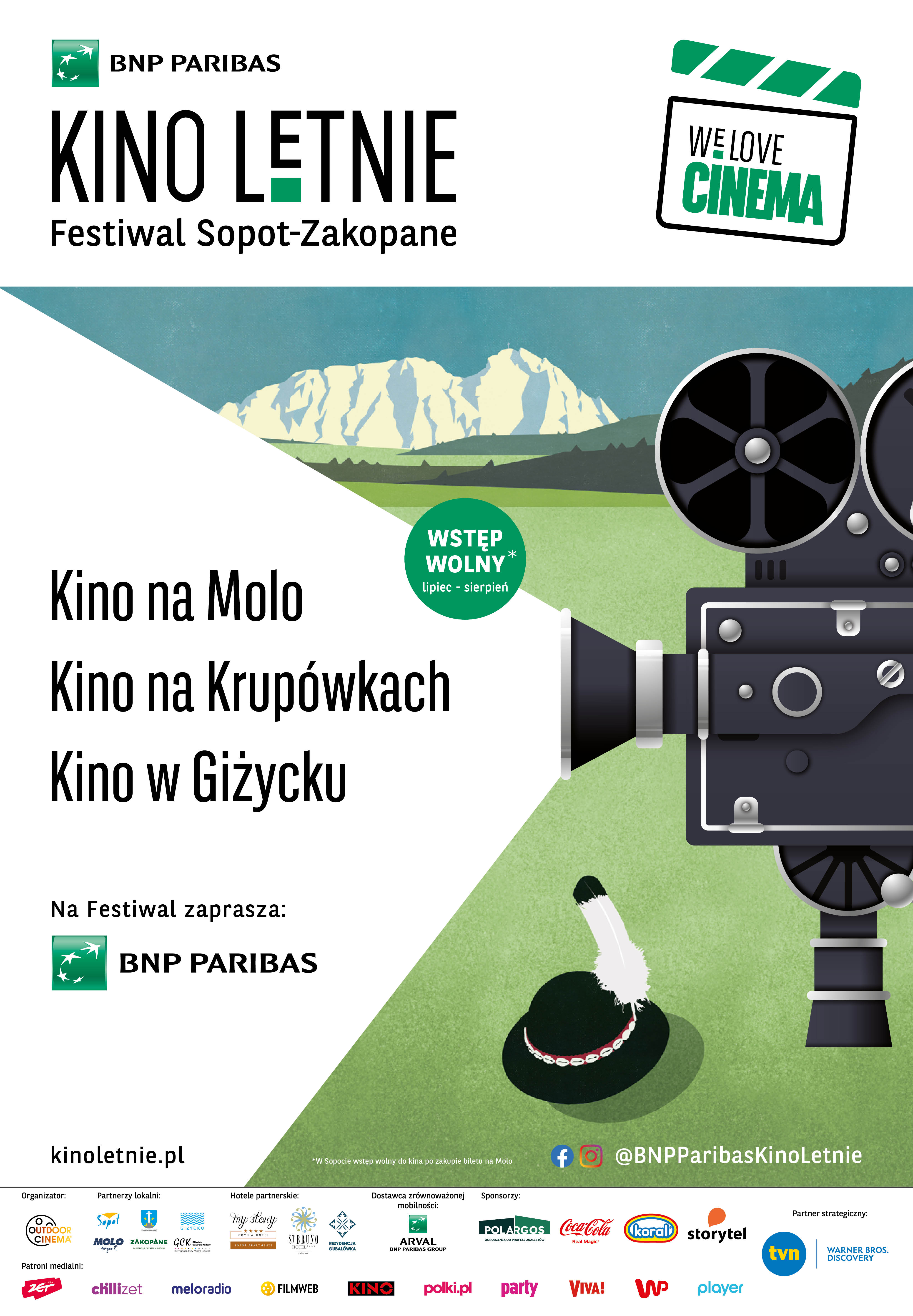 Kino Letnie Sopot-Zakopane to najlepsze filmowe wakacje dla wszystkich od Bałtyku do Tatr. Przez całe wakacje zapraszamy na codzienne, bezpłatne projekcje filmowe w Sopocie i w Zakopanem w ramach najdłuższego wakacyjnego festiwalu filmowego miast partnerskich. Dodatkowo, we wtorki i środy festiwal cumuje w Ekomarinie w Giżycku. Codziennie będziemy rozkoszować się filmami w niepowtarzalnych warunkach przyrody. W Sopocie projekcje odbywają się na słynnym sopockim Molo, w Zakopanem na Kulturalnym Placu Niepodległości, tuż obok Krupówek z widokiem na Giewont, a w Giżycku w Ekomarinie nad jeziorem Niegocin, gdzie filmy oglądać można nawet z przycumowanych jachtów. W programie znajdują się filmy Oscarowe i nagradzane na największych światowych festiwalach. Wspólnie z Bankiem BNP Paribas zmieniamy świat na lepsze. W repertuarze znalazły się filmy odnoszące się do „Agendy 2030 na rzecz zrównoważonego rozwoju”, poruszające temat degradacji i naprawy świata oraz