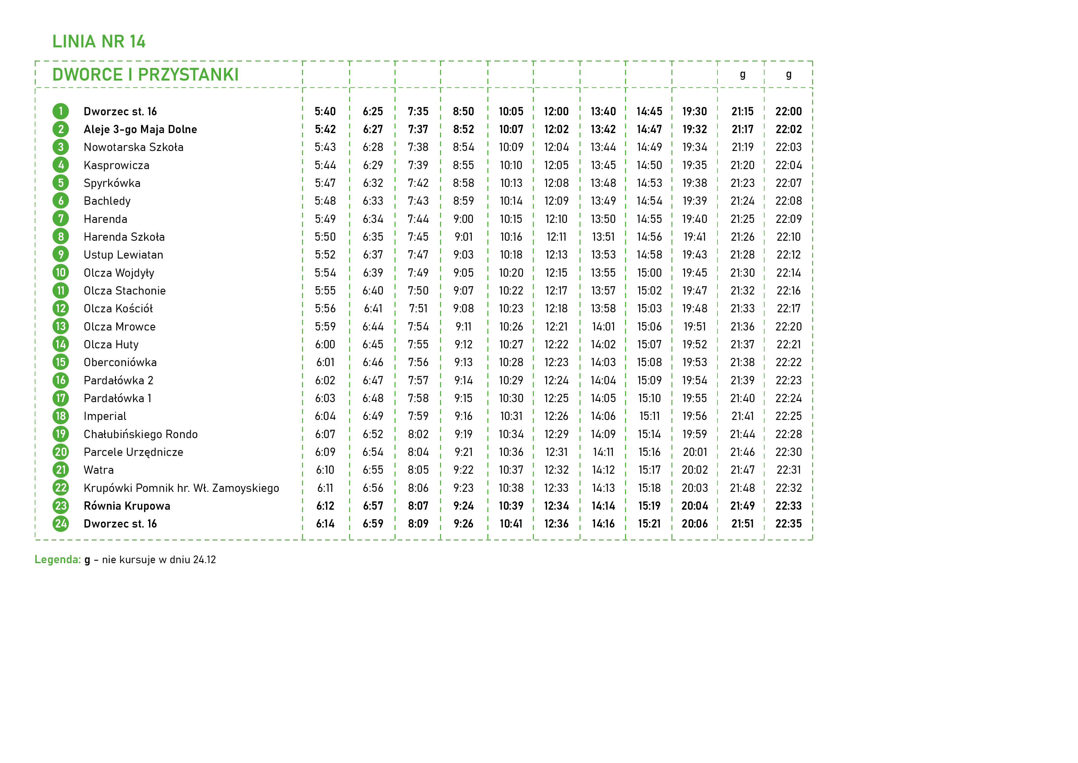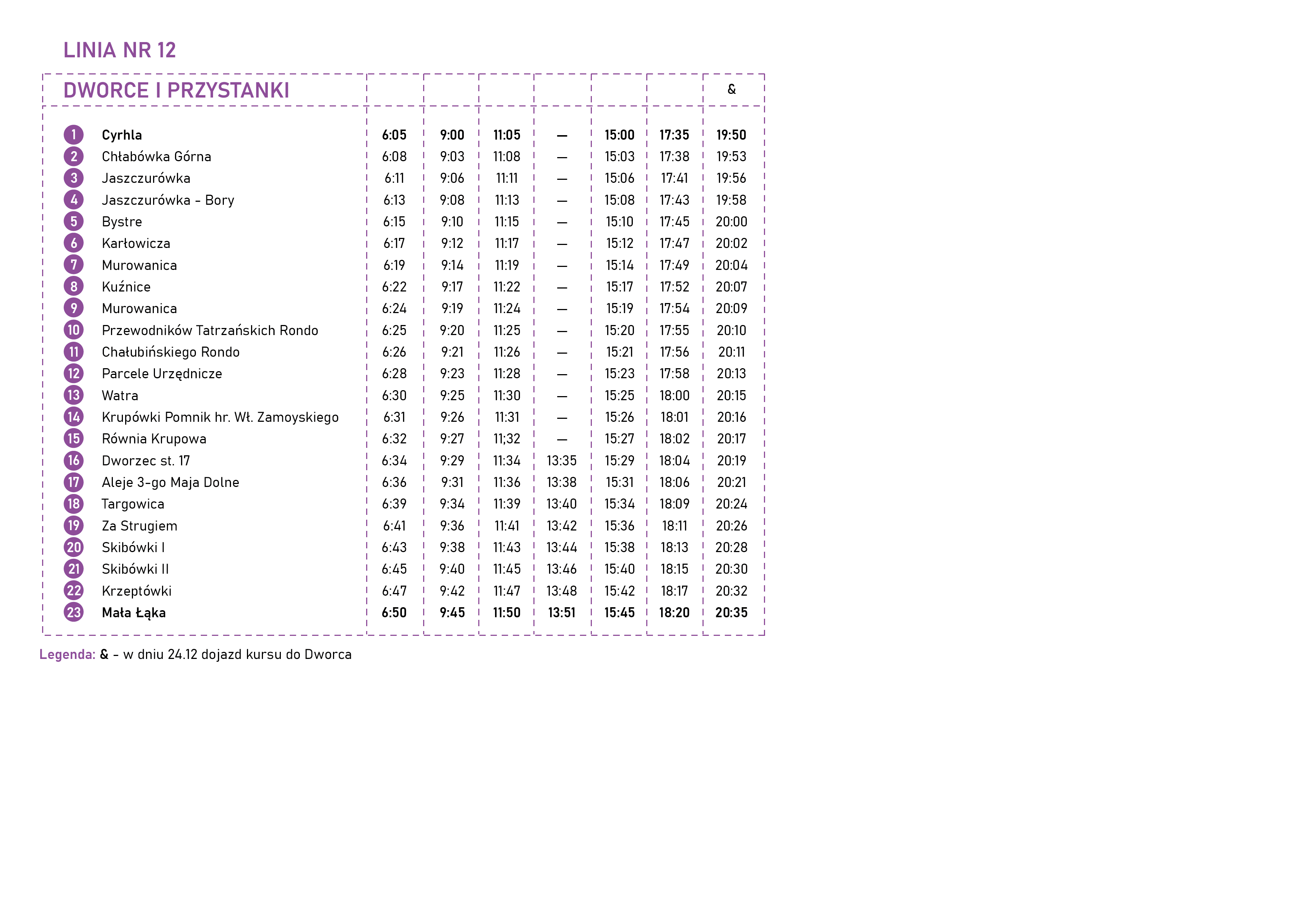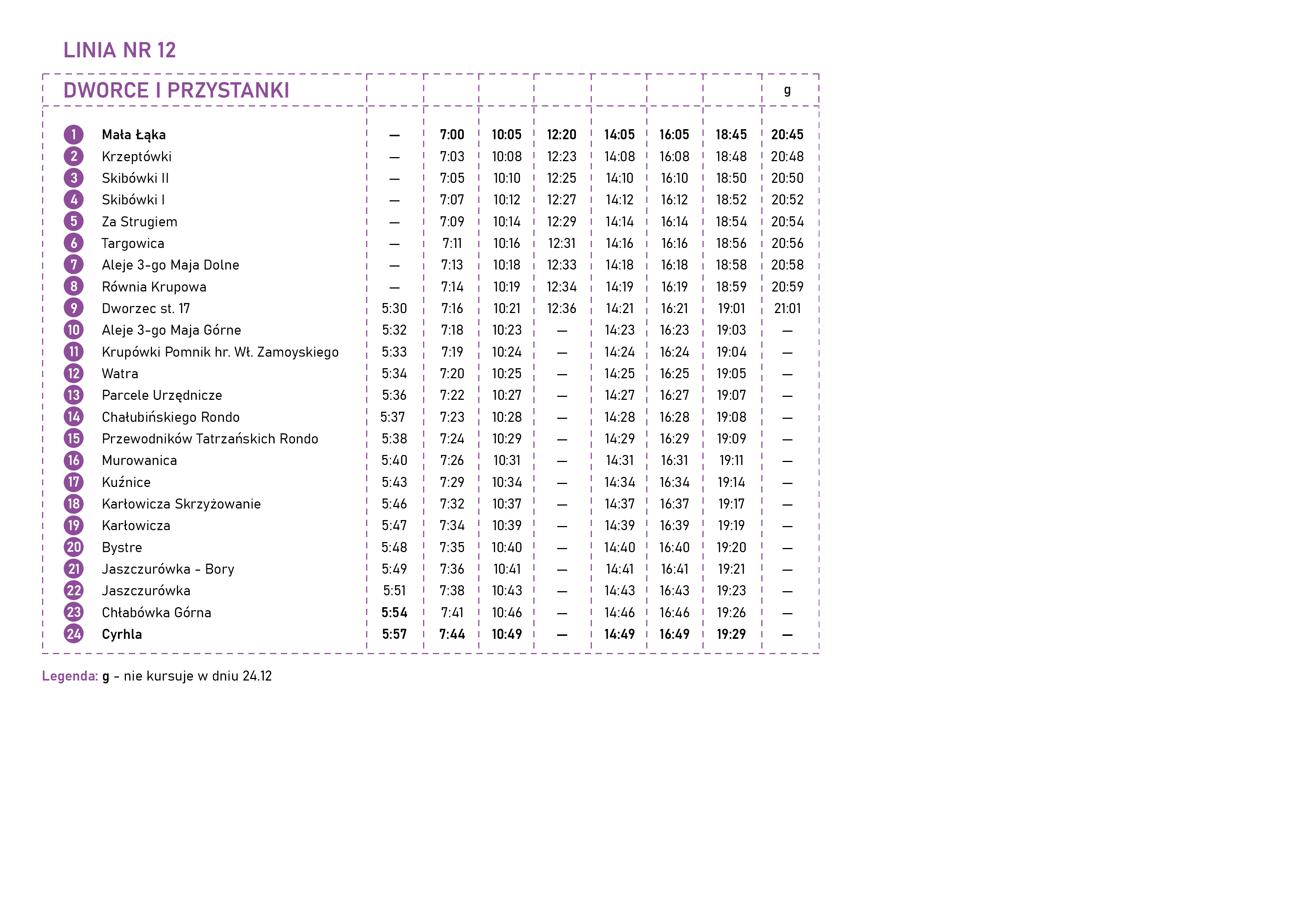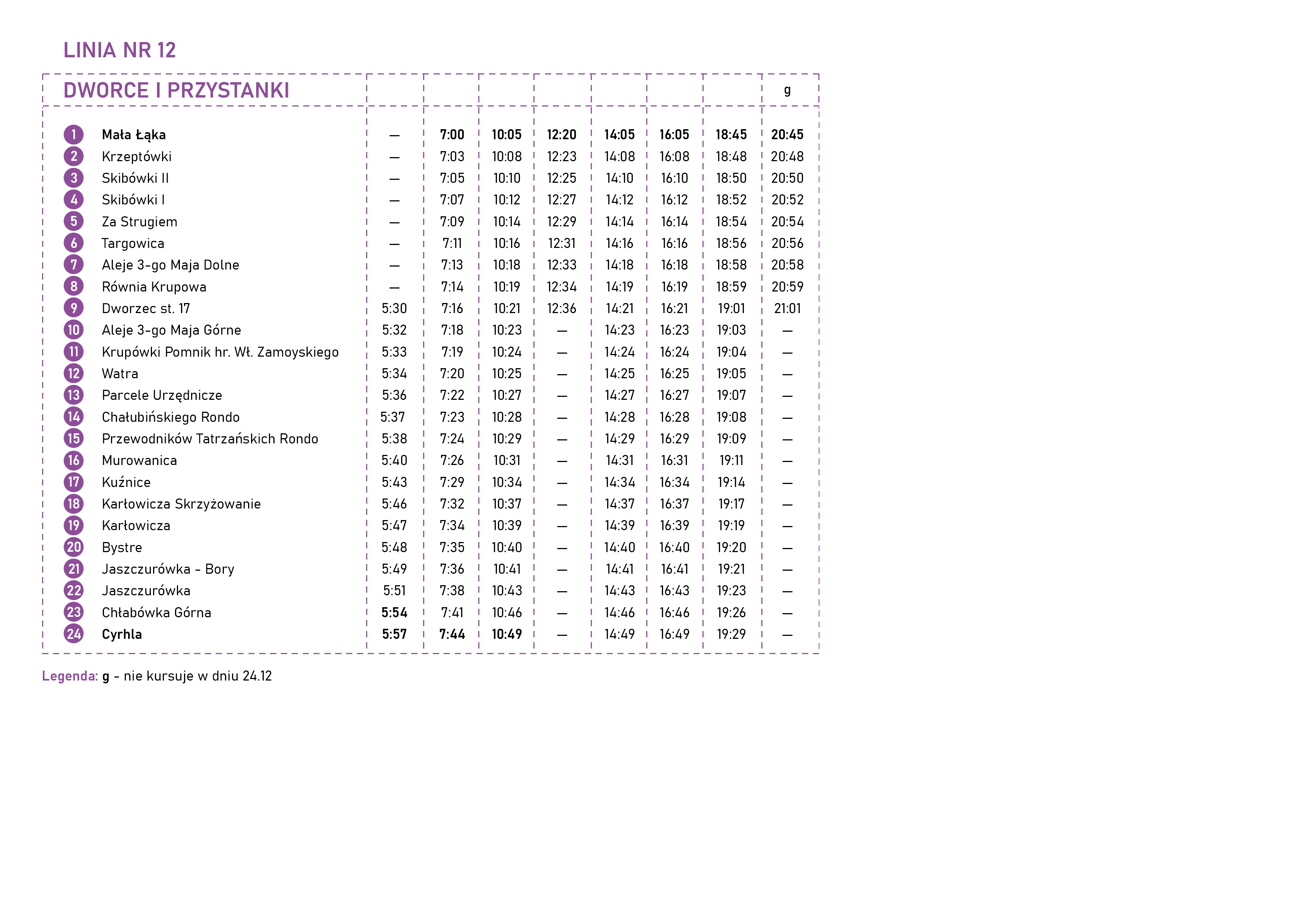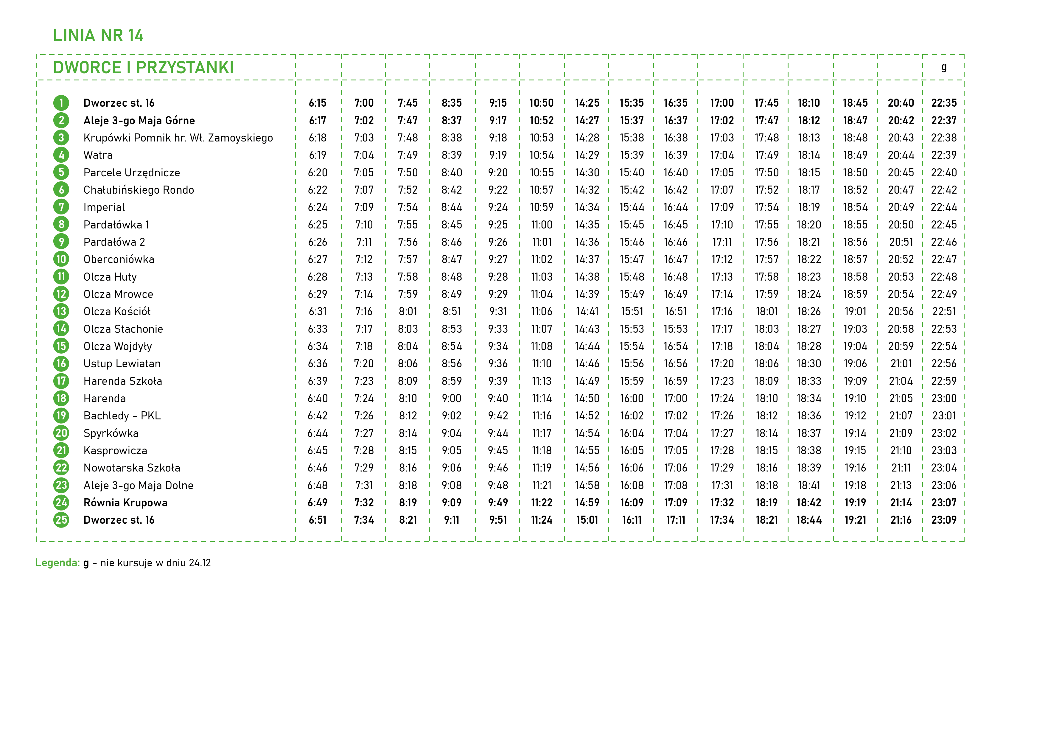 Rondo — Imperial — Pardałówka 1 — Pardałówka 2 — Oberconiówka —Olcza Huty — Olcza Mrowce — Olcza Kościół —Olcza Stachonie — Olcza Wojdyły — Ustup Lewiatan —Harenda Szkoła — Harenda — Bachledy-PKL —Spyrkówka — Kasprowicza — Nowotarska Szkoła — Aleje 3-go Maja Dolne — Równia Krupowa —
