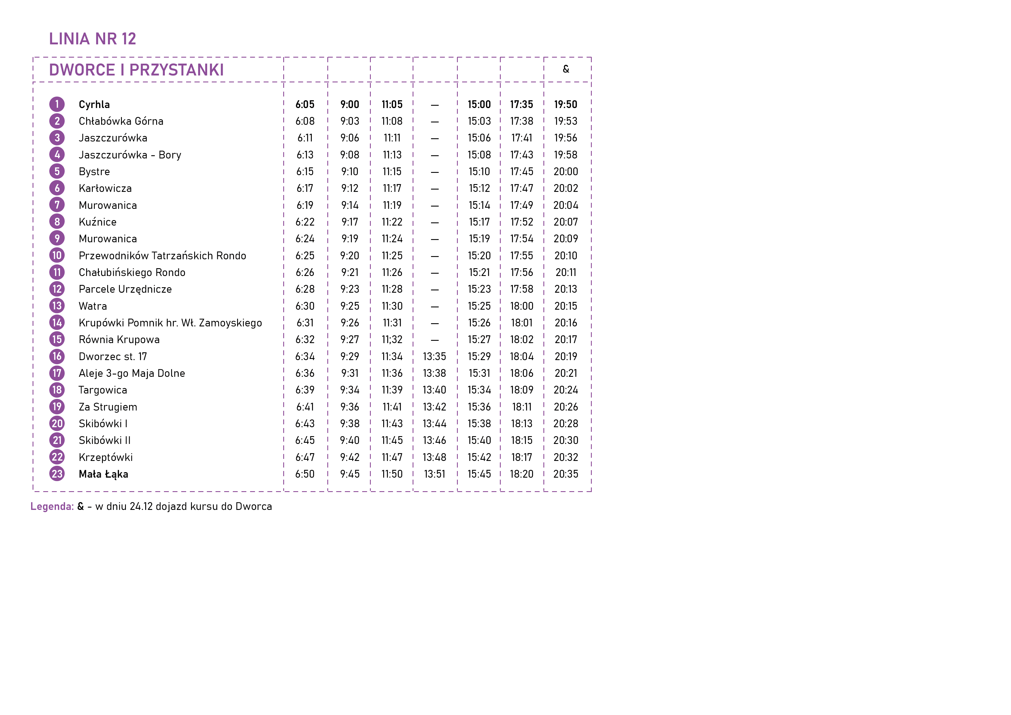 Szkoła —Kasprowicza —Spyrkówka —Bachledy — Harenda — Harenda Szkoła — Ustup Lewiatan — Ustup — Olcza Wojdyły —Olcza Stachonie — Olcza Kościół — Olcza Mrowce — Olcza Huty — Oberconiówka — Pardałówka 2 — Pardałówka 1 —Imperial — Chałubińskiego Rondo — Parcele Urzędnicze — Watra — Krupówki Pomnik hr. Wł. Zamoyskiego — Równia