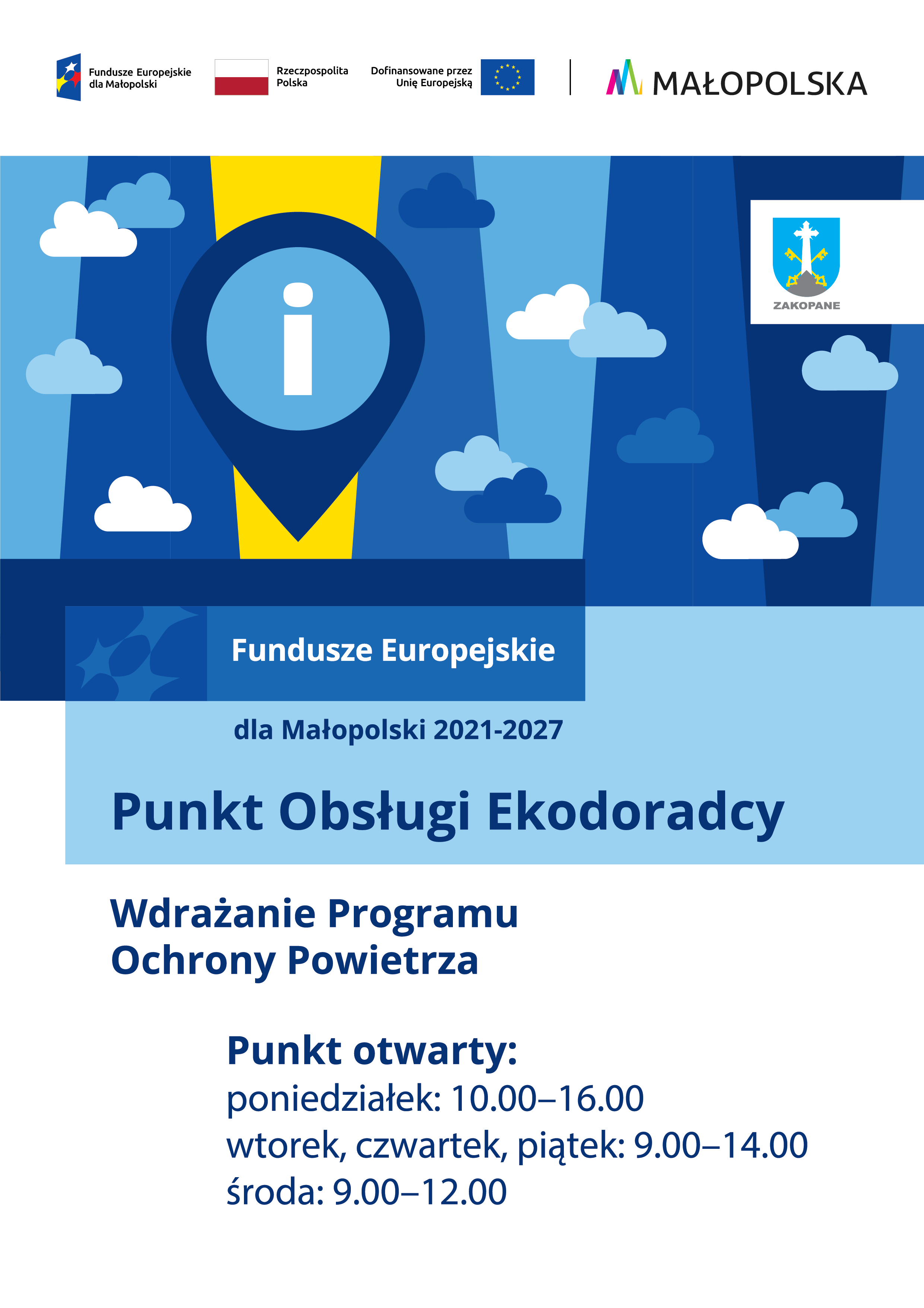 Projekt pt.: „Wdrożenie Programu ochrony powietrza w Gminie Miasto Zakopane”, został wybrany do dofinansowania w ramach Programu: Fundusze Europejskie dla Małopolski 2021-2027, Działania: Wdrażanie Programu ochrony powietrza, przy wsparciu finansowym Europejskiego Funduszu Rozwoju Regionalnego.