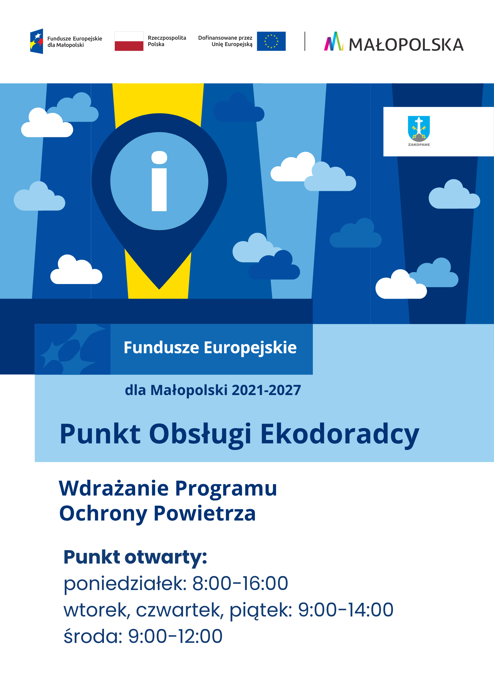 W okresie 01.01.2024 r. – 31.12.2026 r. Gmina Miasto Zakopane realizuje projekt nrFEMP.02.05-IZ.00-0019/23 pn. „Wdrożenie Programu ochrony powietrza w Gminie Miasto Zakopane” współfinansowany przez Unię Europejską w ramach Programu Fundusze Europejskie dla Małopolski lata 2021-2027 Priorytet 2 Fundusze Europejskie dla środowiska, Działanie 2.5 Wdrażanie Programu Ochrony Powietrza, Typ projektu
