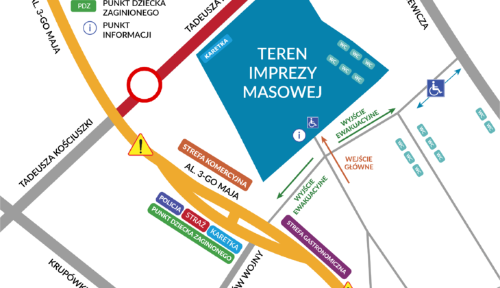 · Zamknięta dla ruchu samochodowego zostanie ul. Kościuszki na odcinku od skrzyżowania z ul. Sienkiewicza do skrzyżowania z Alejami 3 -go Maja.