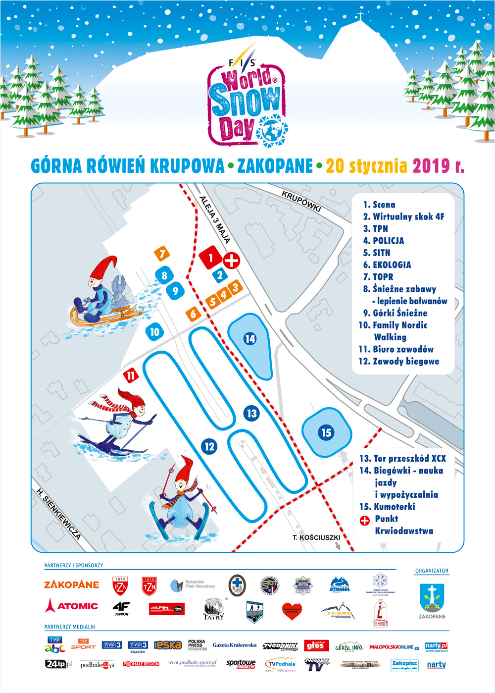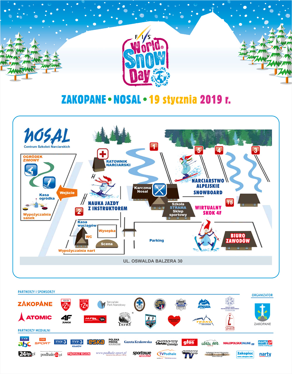 W dniu oficjalnych obchodów World Snow Day na świecie tj. 20 stycznia 2019 r. (niedziela) na Górnej Równi Krupowej w Zakopanem rozegrane zostaną zawody w narciarstwie biegowym, a najodważniejsze dzieci będą mogły spróbować swoich sił na specjalnie przygotowanym torze przeszkód Cross Country Cross, służącym do doskonalenia umiejętności narciarskich. Uczestnicy World Snow Day, którzy jeszcze nigdy nie mieli nart biegowych na nogach, będą mieli niepowtarzalną okazję spędzenia miłych chwil z instruktorami narciarstwa biegowego, darmowego wypożyczenia nart biegowych oraz nieodpłatnej nauki jazdy na biegówkach! W tym roku podczas Światowego Dnia Śniegu zachęcać będziemy także do rodzinnego uprawiania nordic walking, a chętnie dzieci wraz z rodzicami będą mogły wziąć udział w małej rywalizacji w tej dyscyplinie.Do dyspozycji dzieci będzie również śnieżna górka na której najmłodsi będą mogli zjeżdżać na jabłuszkach, zagrać w piłkę nożną na nartach oraz lepić bałwany. Nasi zakopiańscy nauczyciele wychowania fizycznego zadbają o to, aby nie zabrakło również innych gier sportowych dla dzieci.