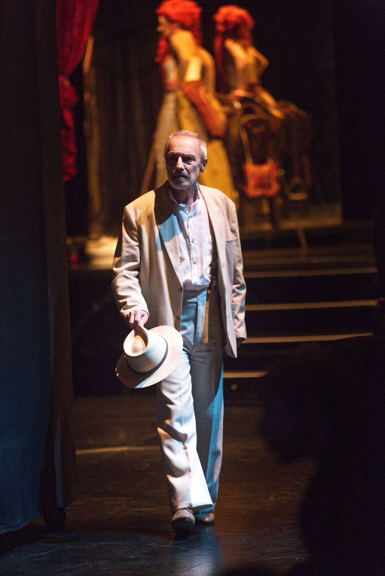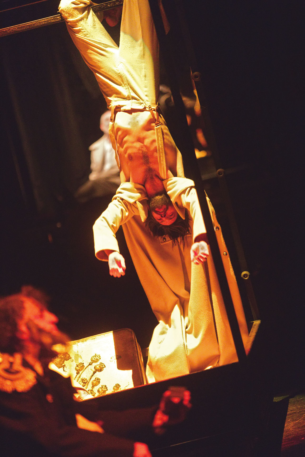 W zakopiańskiej inscenizacji postać głównego bohatera grana jest przez dwóch aktorów – Piotra Łakomika (młody Karmazyniello) oraz Krzysztofa Łakomika (stary Karmazyniello). Dodatkowym niuansem jest tutaj fakt, że wymienieni aktorzy to w rzeczywistości syn i ojciec. Dzięki takiemu zabiegowi reżyserowi udało się podkreślić pewną dychotomię głównego bohatera – młodszy jest bardziej porywczy, emocjonalny, z kolei starszy – bardziej refleksyjny. Pokazana została tu skomplikowana osobowość głównego bohatera – jego dwoistość i rozbicie. W starszym Karmazyniellu dostrzec możemy głęboki smutek, gdy patrzy na siebie młodszego, miotającego się, nierozumiejącego. Młody bohater zadając pytania ma nadzieję na znalezienie odpowiedzi, ale czas mija i widzimy starszego Karmazyniella, który nadal wobec tych wszystkich pytań jest bezradny.