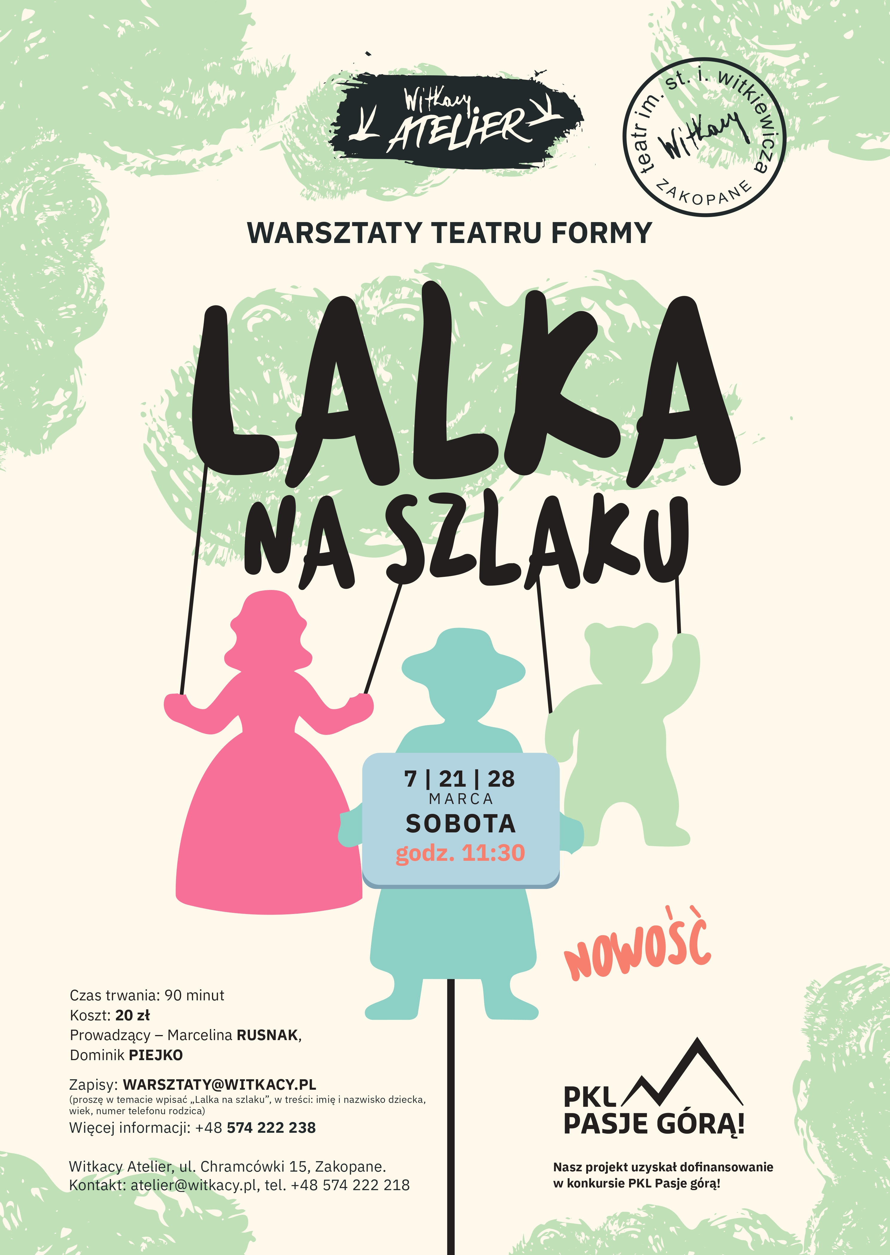 Zapisy: warsztaty@witkacy.pl (proszę w temacie wpisać „Lalka na szlaku”, w treści: imię i nazwisko dziecka, wiek, numer telefonu rodzica),