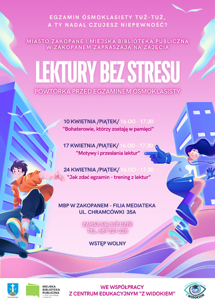 Miasto Zakopane i Miejska Biblioteka Publiczna w Zakopanem we współpracy z Centrum Edukacyjnym „Z Widokiem” zapraszają na cykl 3 spotkań warsztatowych, na których powtórzymy najważniejsze treści z lektur obowiązkowych i przygotujemy się do rozwiązywania zadań egzaminacyjnych z języka polskiego.