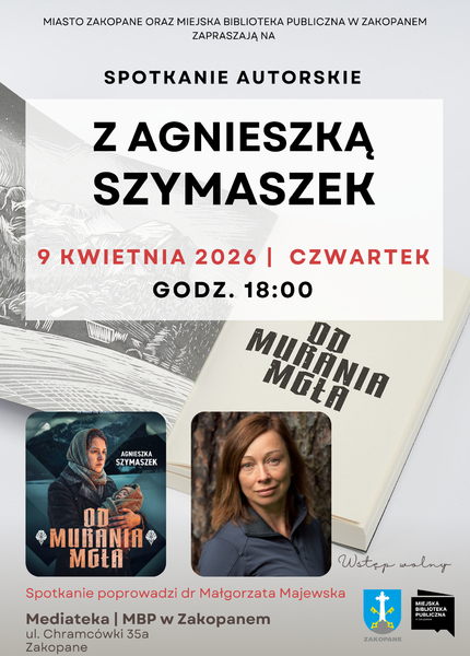 Miasto Zakopane oraz Miejska Biblioteka Publiczna w Zakopanem zapraszają na spotkanie autorskie z Agnieszką Szymaszek.