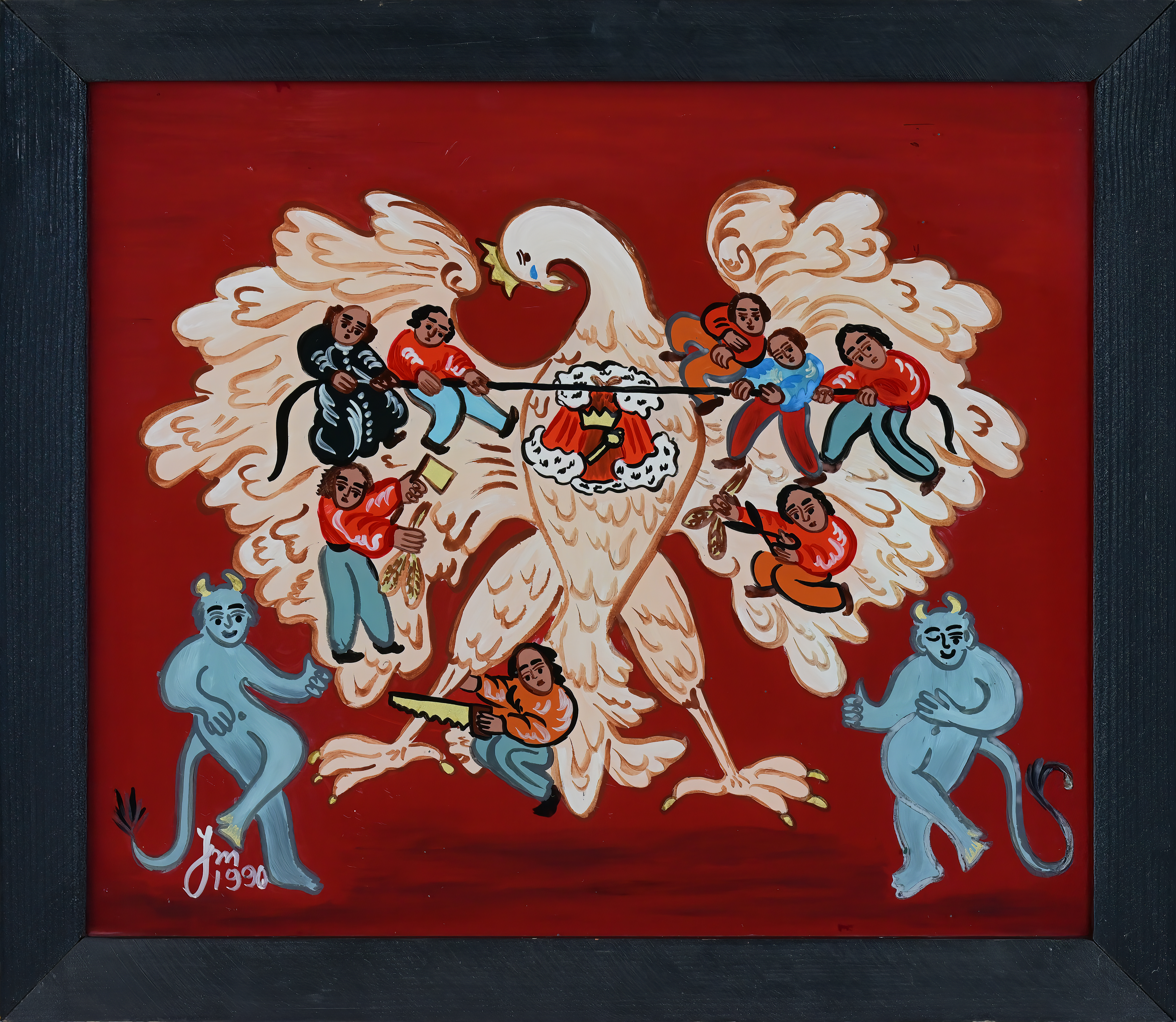 Pokusiła się też o własny sąd nad światem, który – poddany władzy dzisiejszych bożków i mamideł – wykoślawił zgłoski Dekalogu, rozmienił sumienie na brzęczącą monetę. Jej malarskie puenty i komentarze – to prawdziwe rekolekcje na szkle: odważne, celne, dowcipne, a przejmujące i cierpkie zarazem. Tu właśnie pękła rama tradycji. Rozszerzył się Janinie krąg tematów i cały świat przedstawiony, a jej artystyczny warsztat dojrzewał do nowej jakości przedstawień.