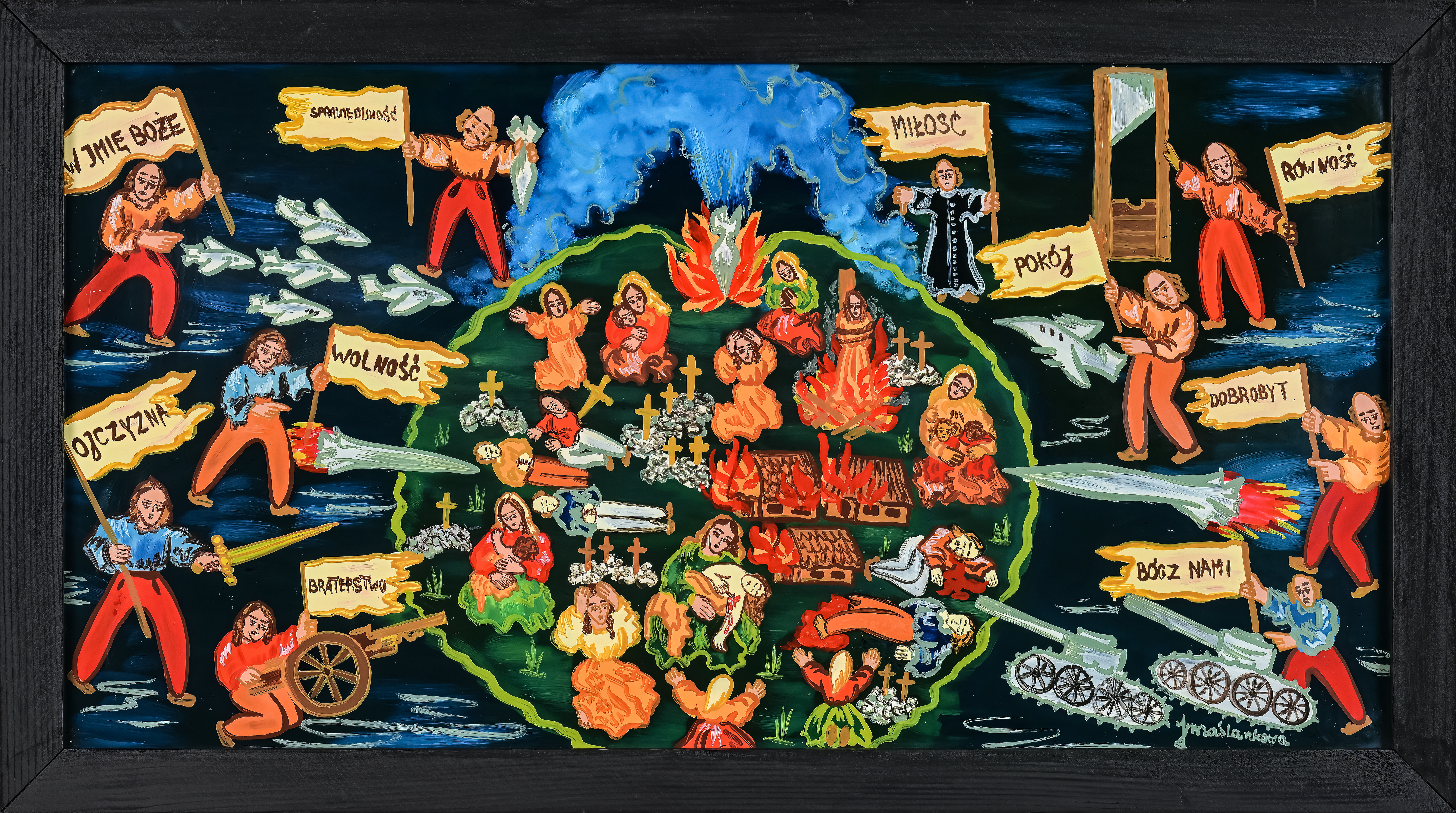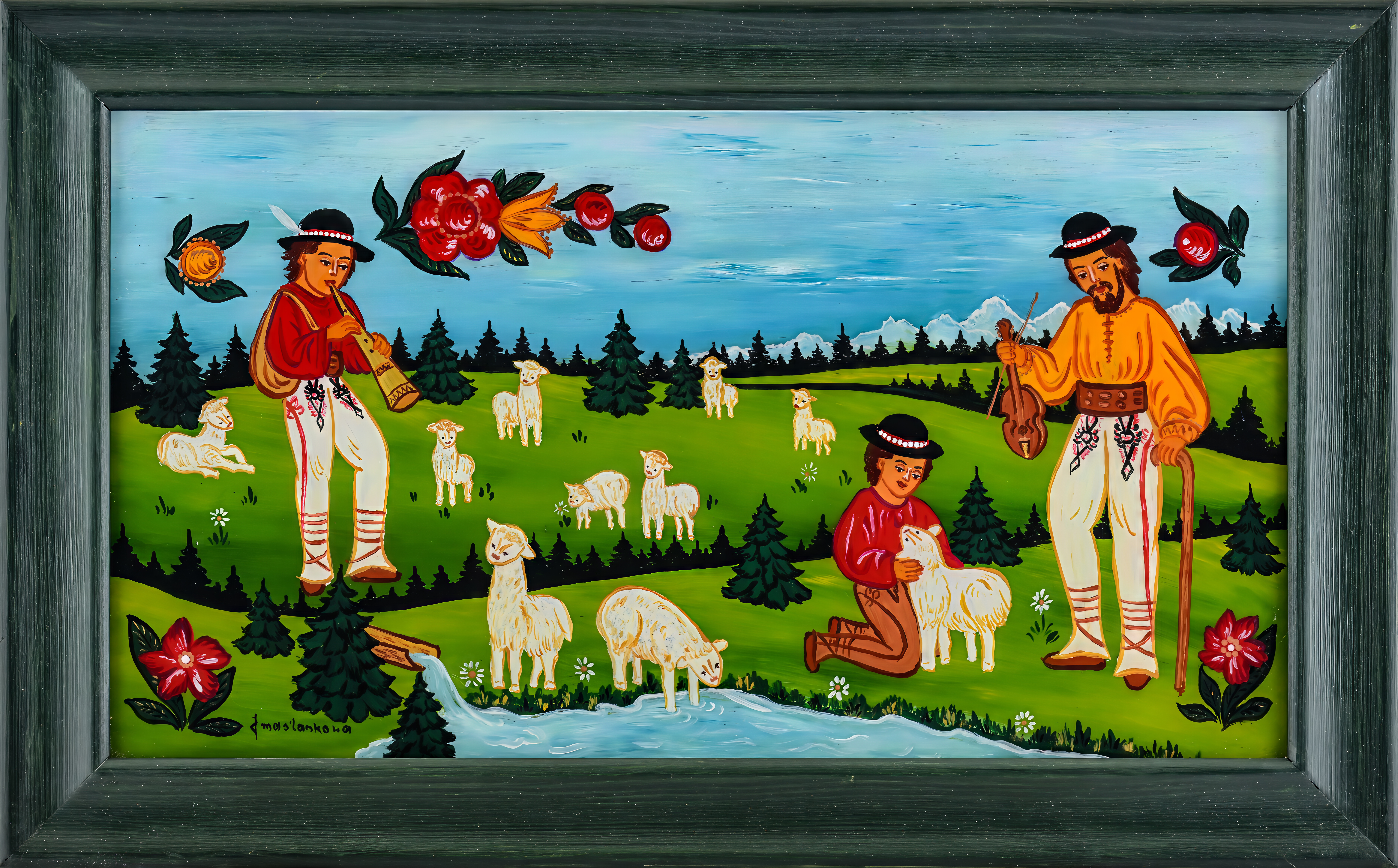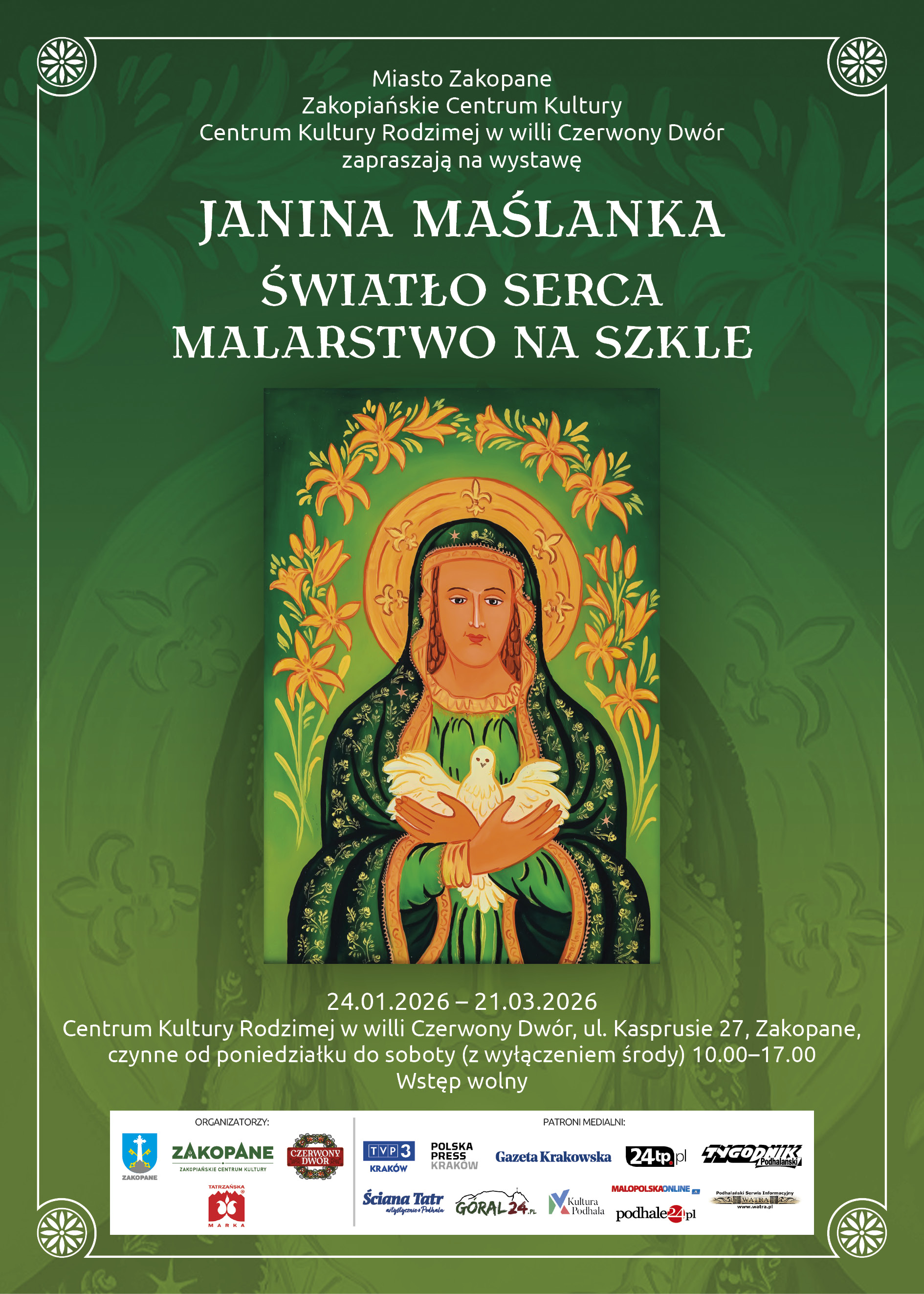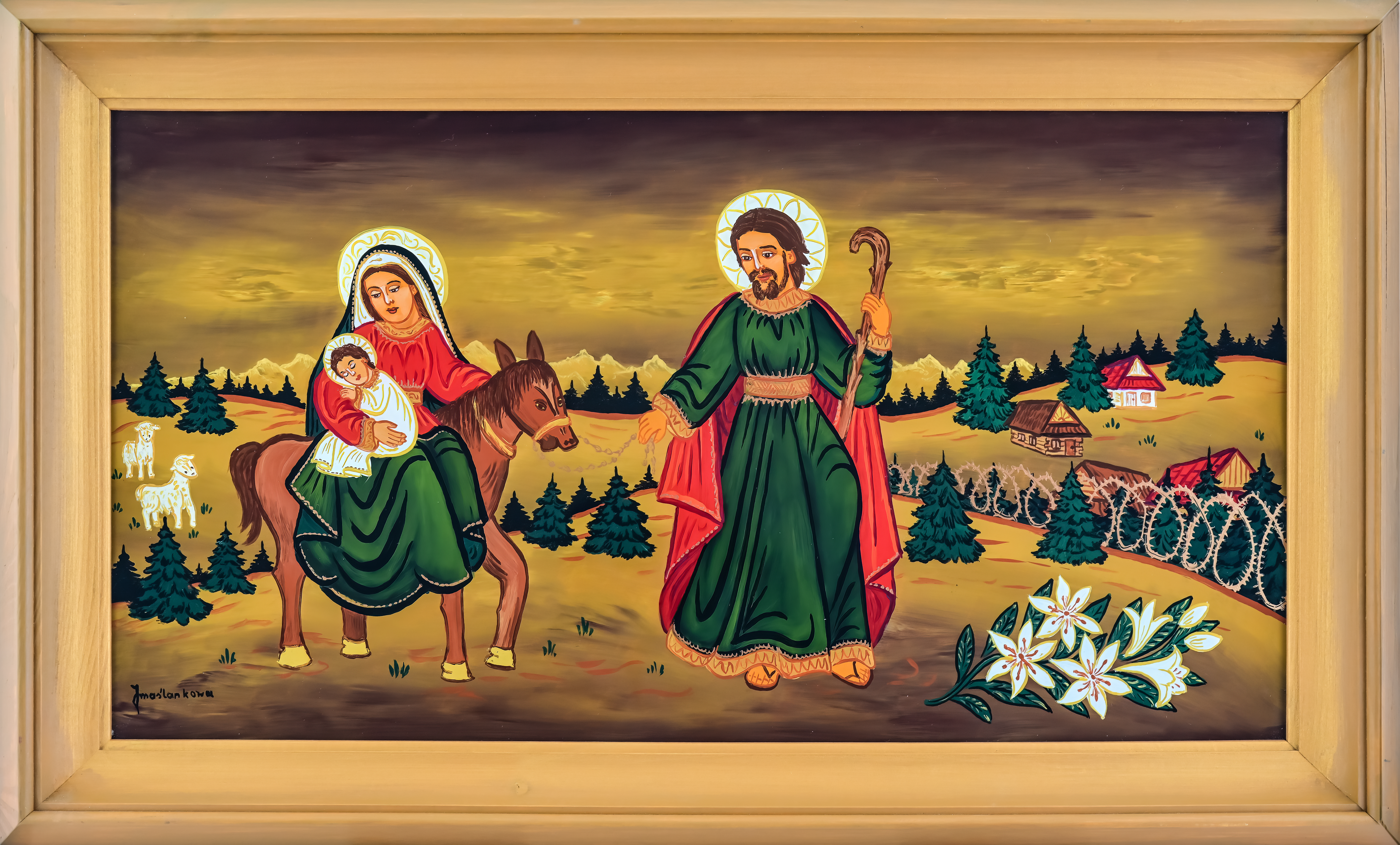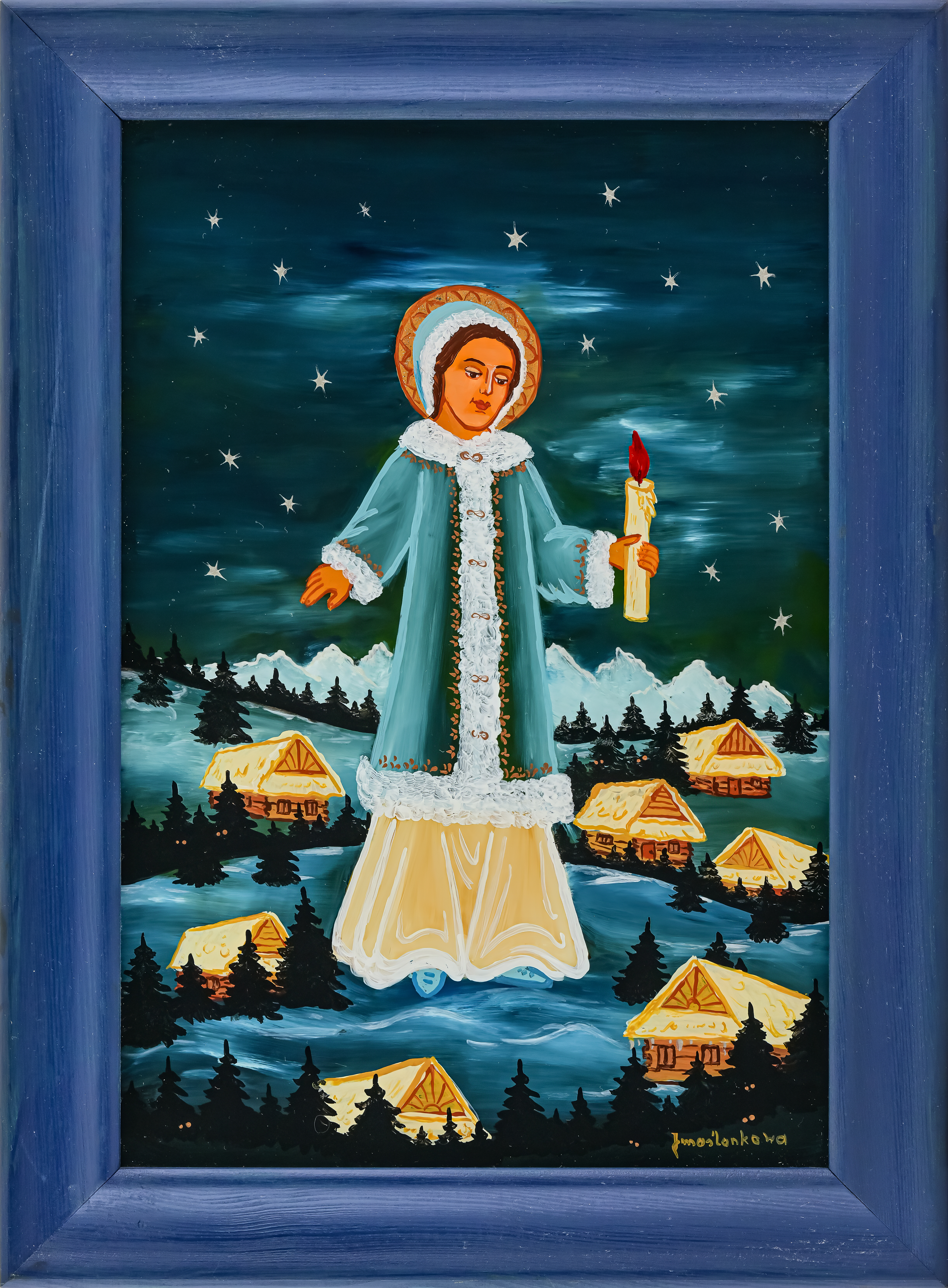 Pośród plejady tak samorodnych, jak i profesjonalnych artystów, podejmujących zmagania z taflą szkła, kompozycją i kolorem – Janinie Marcińczak-Maślankowej z Nowego Targu przypadło miejsce szczególne, bo bardzo długą drogę przebyła od próby zrekonstruowania obrazka na szkle stłuczonego w schronisku na Turbaczu do przedstawień tak świetnie skomponowanych, tak wysmakowanych kolorystycznie, ubranych w cudowny ornament - że zapiera dech w piersiach. Wydaje się, że Opatrzność prowadziła ją od pierwszego pociągnięcia pędzlem do warsztatowej perfekcji. Czy jako dziecko przeżyła zachwyt malarstwem na szkle, które rodziło się podczas odwiedzin w bajkowym domu słynnej już wtedy zakopiańskiej malarki, Eweliny Pęksowej, z którą jej mama przyjaźniła się od przedwojennych lat? Zapewne tak