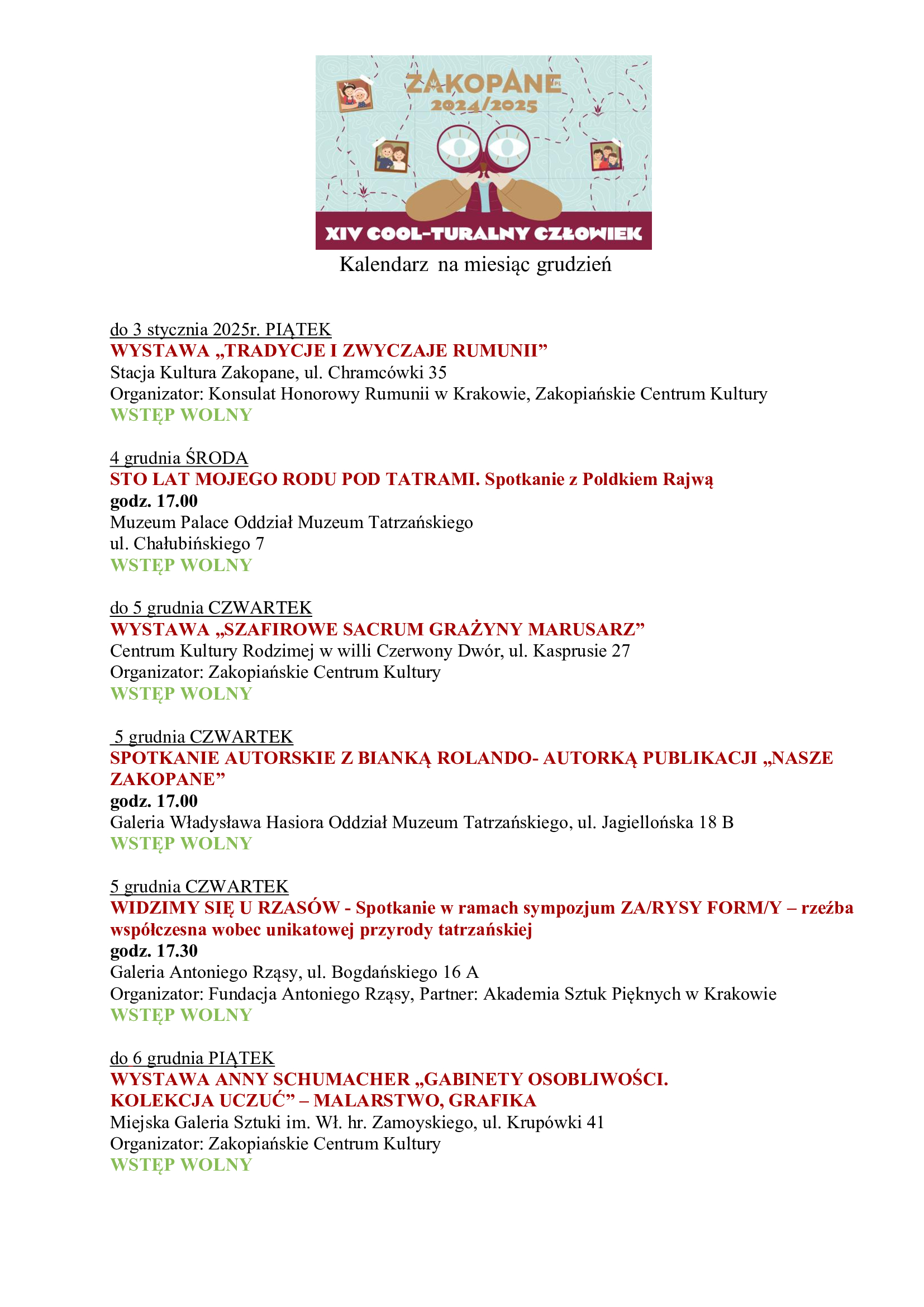 - Co miesiąc zaglądaj do skrzynki mailowej, na facebooka oraz na stronę www.zakopane.pl w zakładkę Cool-turalny Człowiek. Znajdziesz tam newsletter z kalendarzem wydarzeń COOL-turalnego Człowieka.